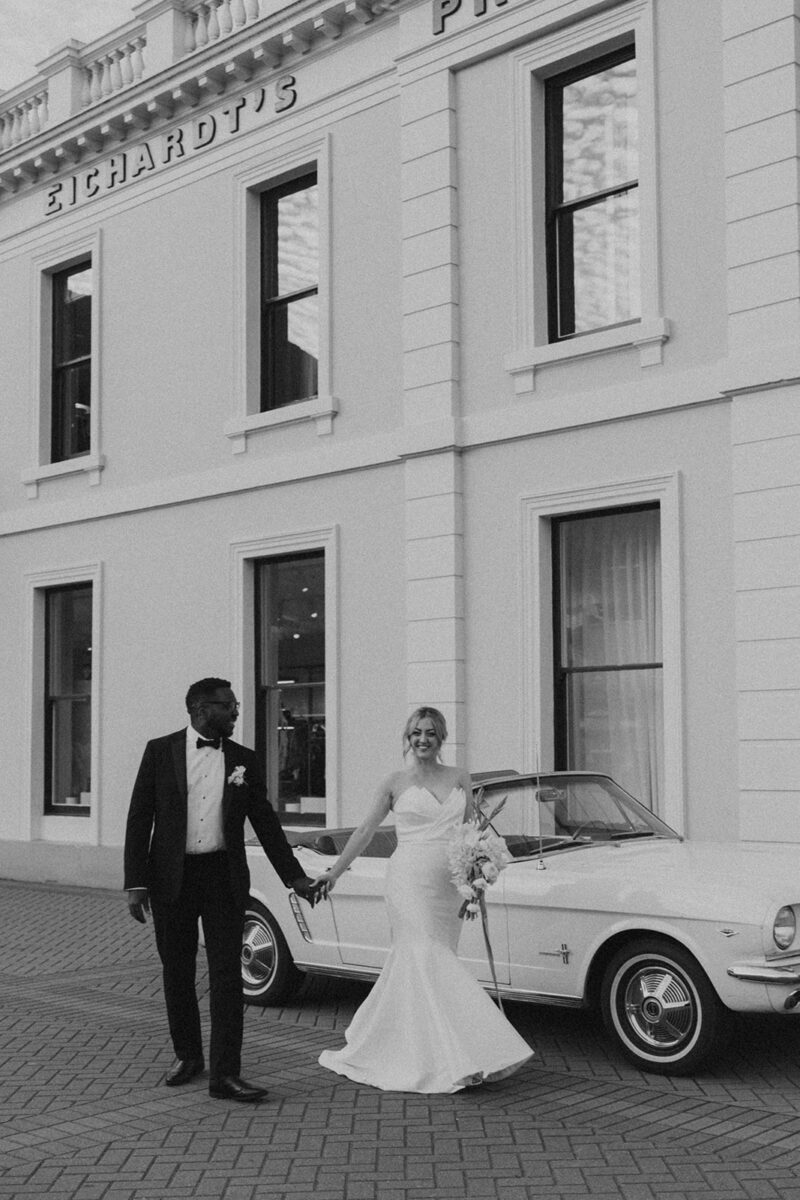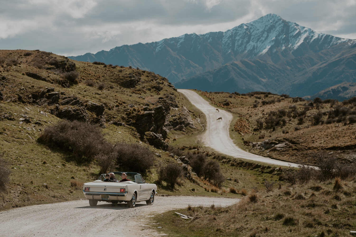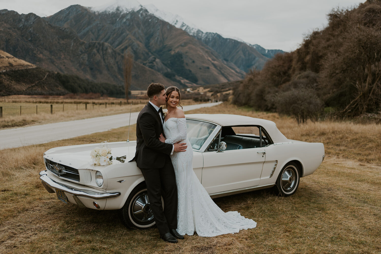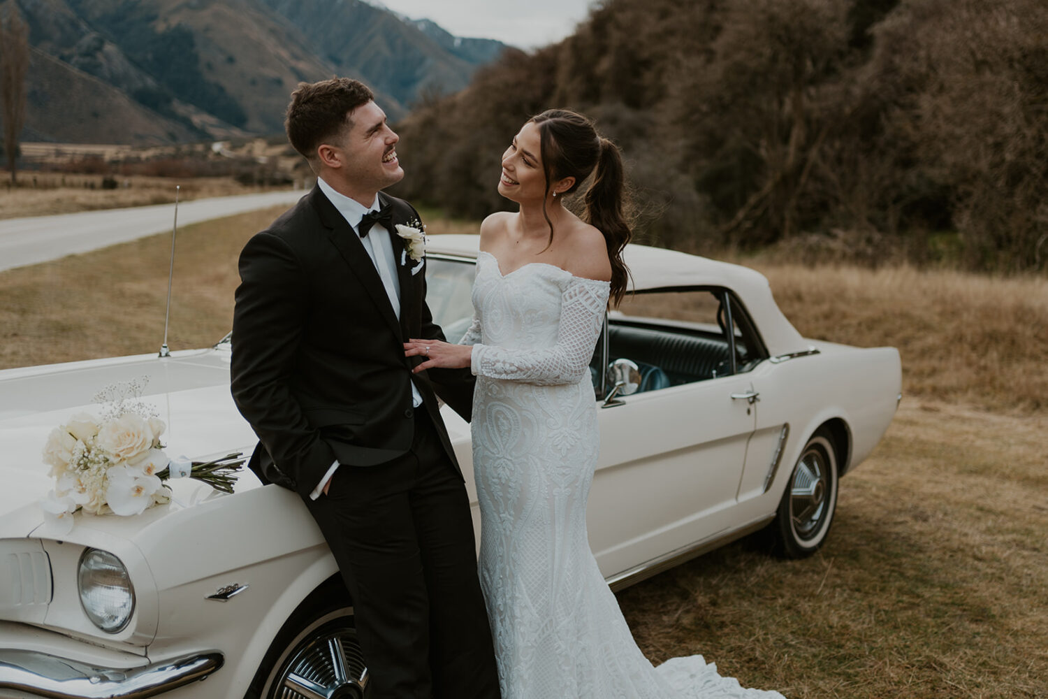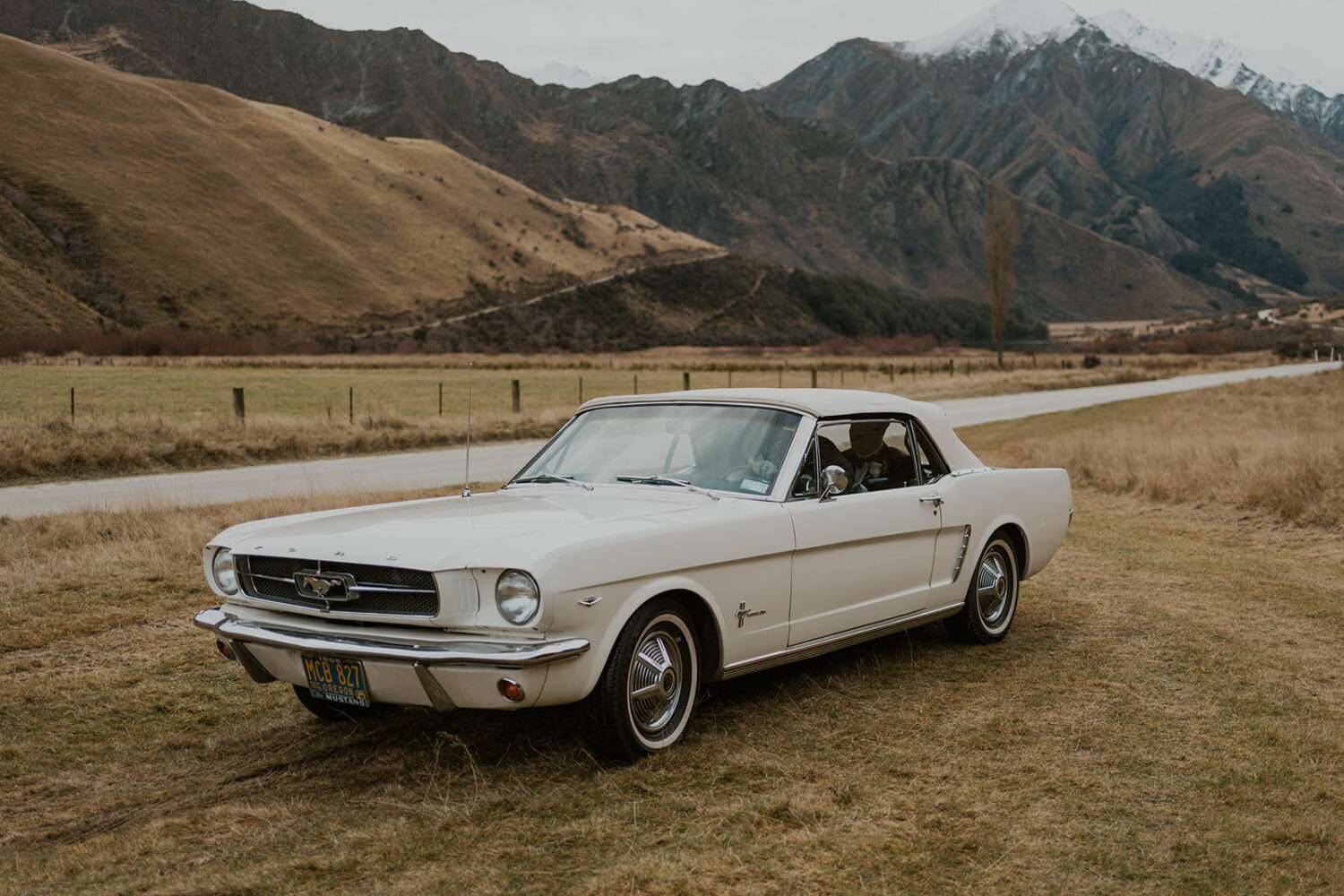 Classic car (Molly) a white 1965 Ford Mustang convertible, available to hire for weddings, photoshoots and video shoots in the Central Otago region, mainly in Queenstown, Arrowtown and Wanaka.