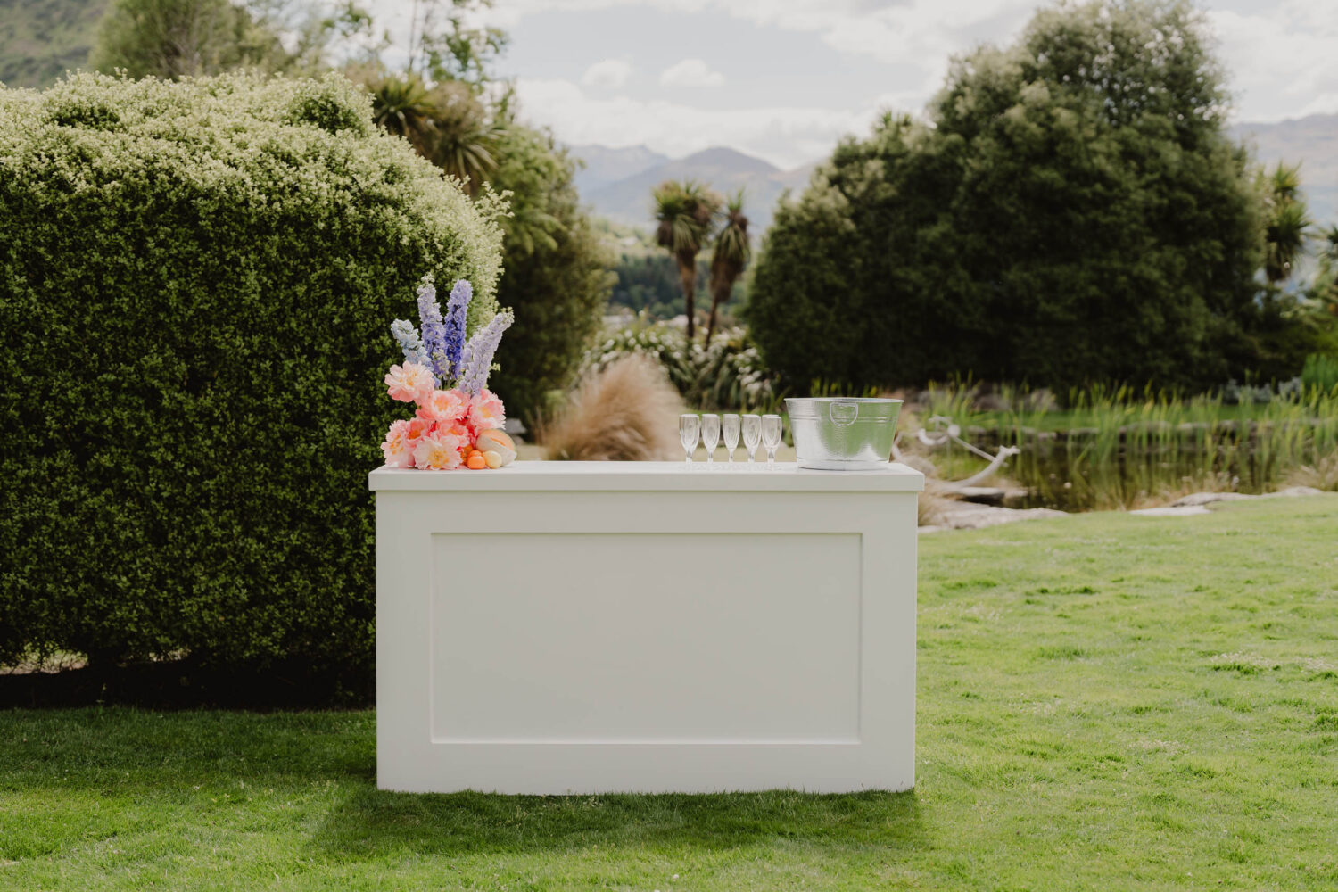 Our modern wooden bar is the perfect centerpiece for your drinks and cocktail hour, or setup within your reception space for an added touch of elegance.