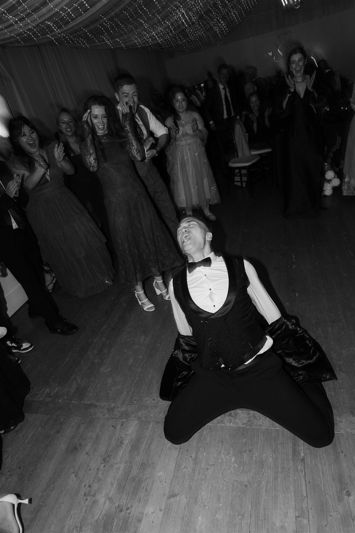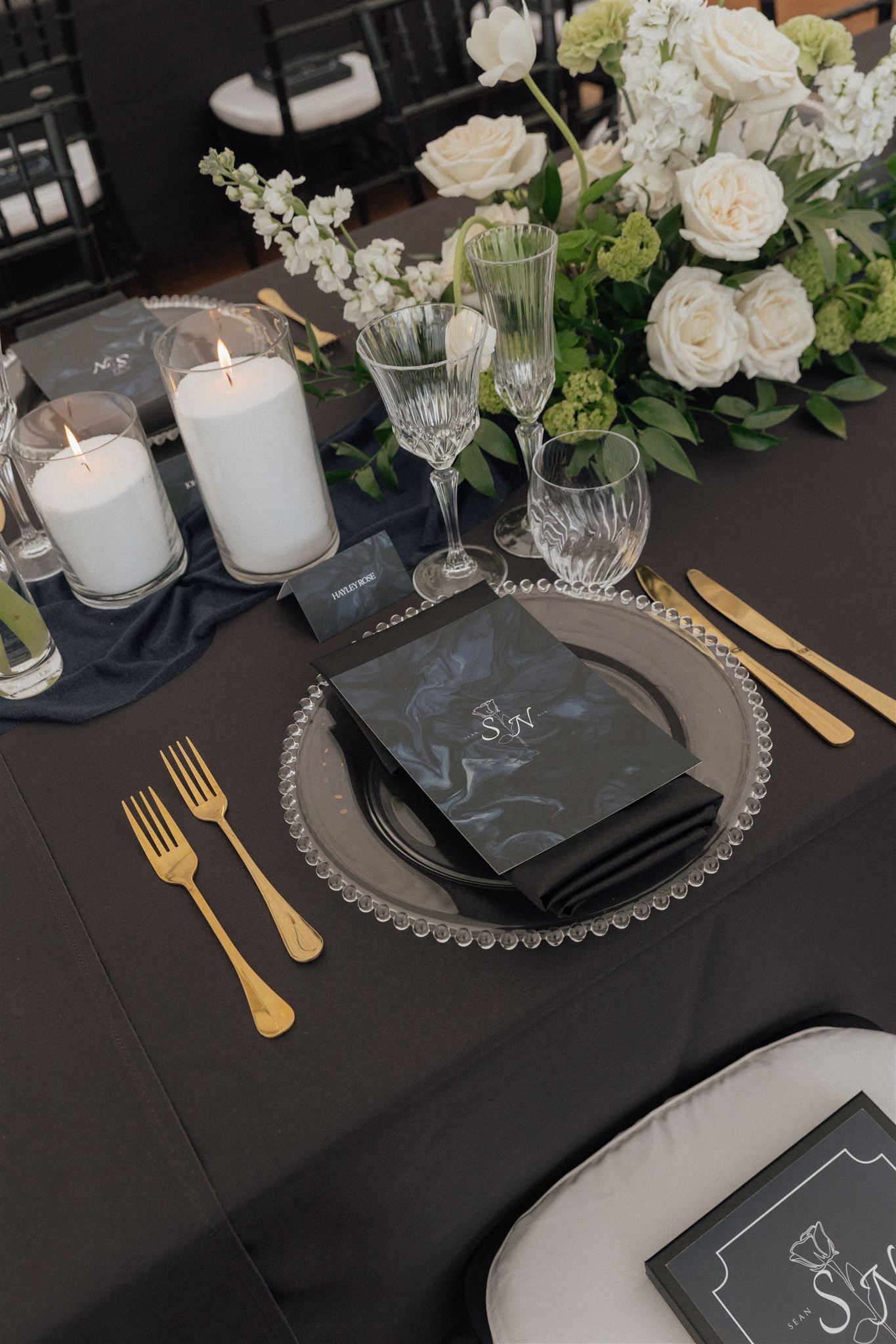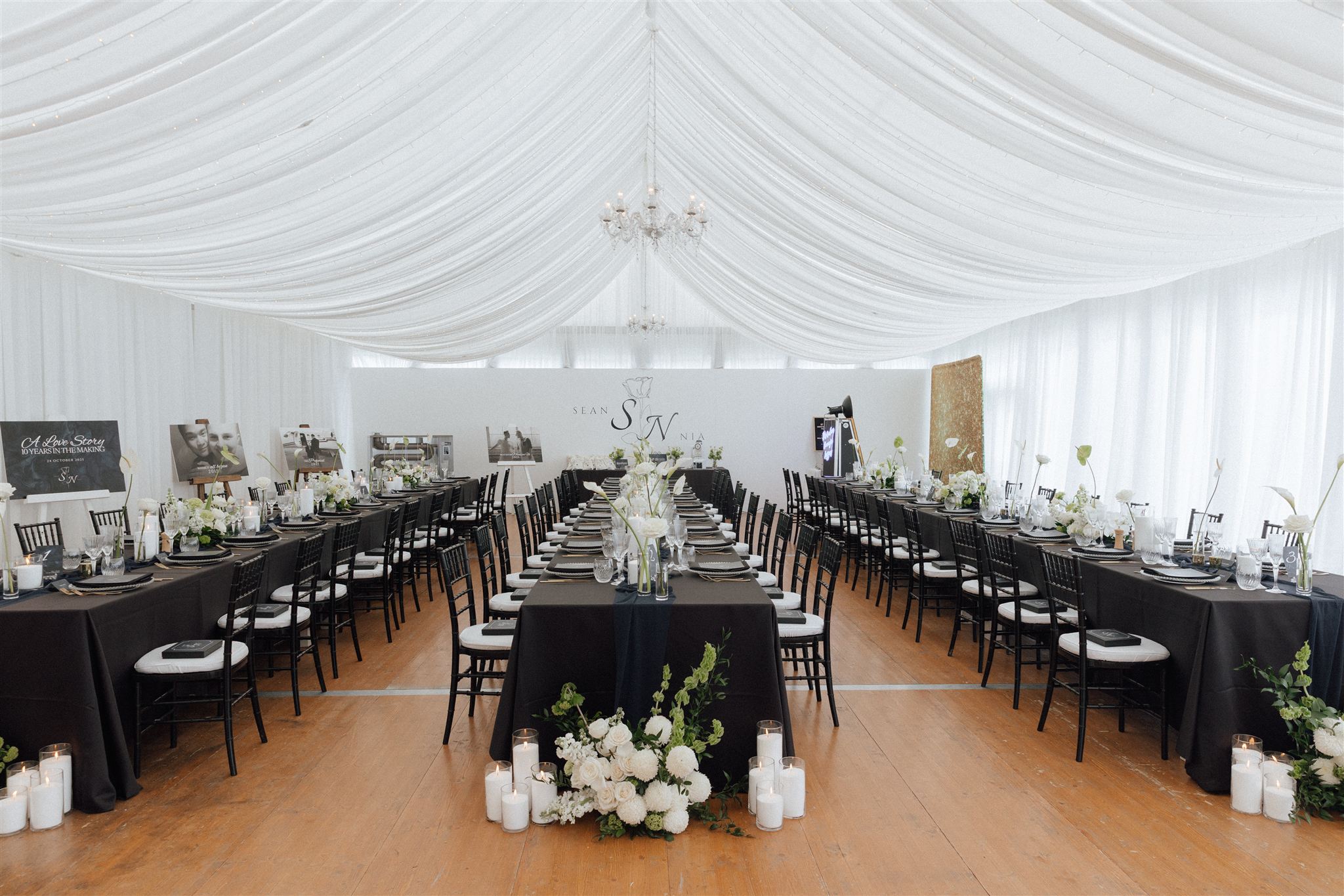 Inside the marquee, the styling made a statement: floor-to-ceiling white linen, black tablecloths, gold cutlery, and green-and-white florals that popped dramatically against the dark tables.
