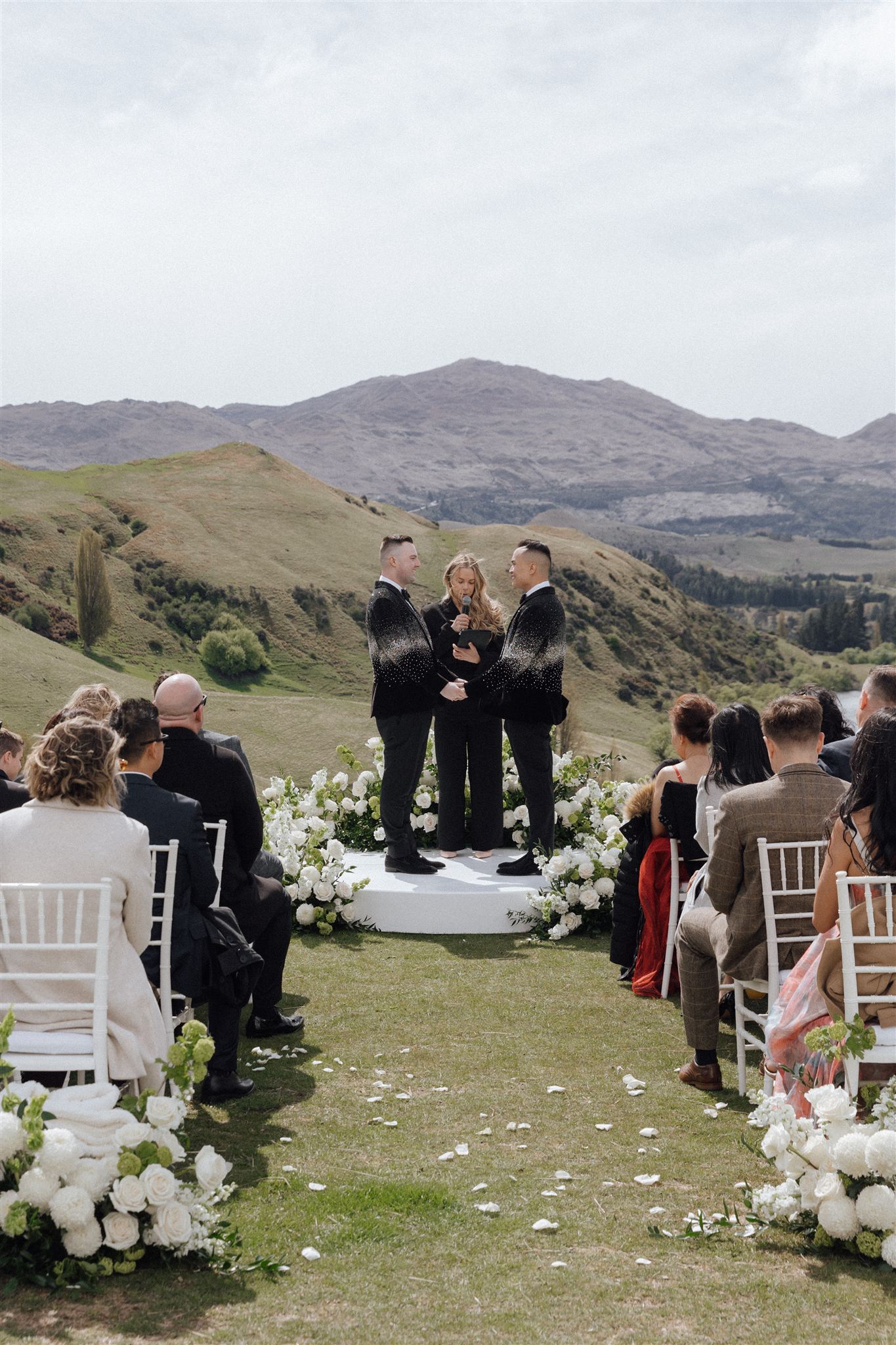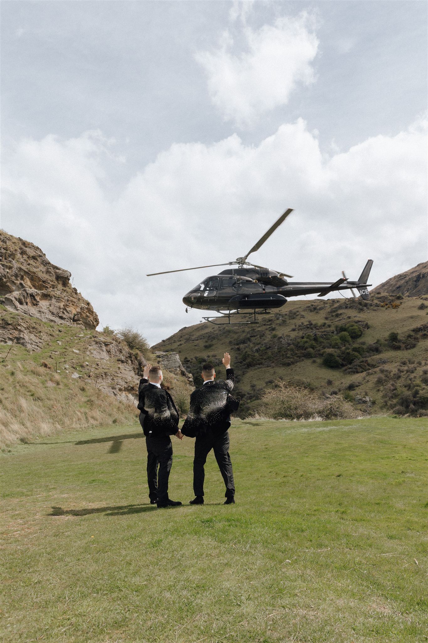 Their day began with an epic flight into the Shotover – soaking up the views before landing in style by helicopter at NZ High Country for their ceremony.