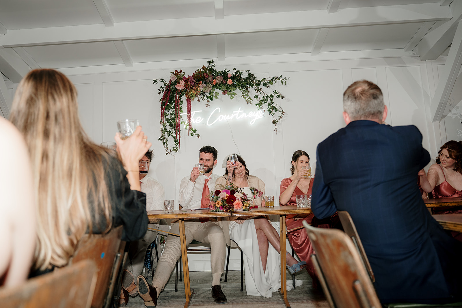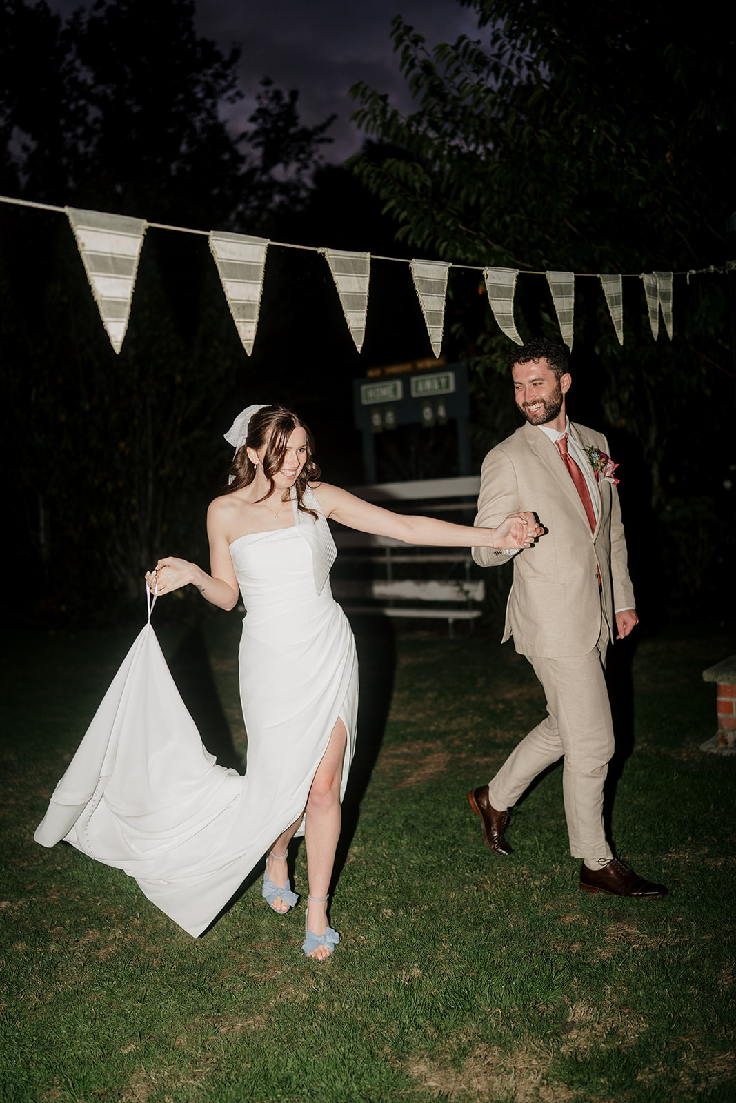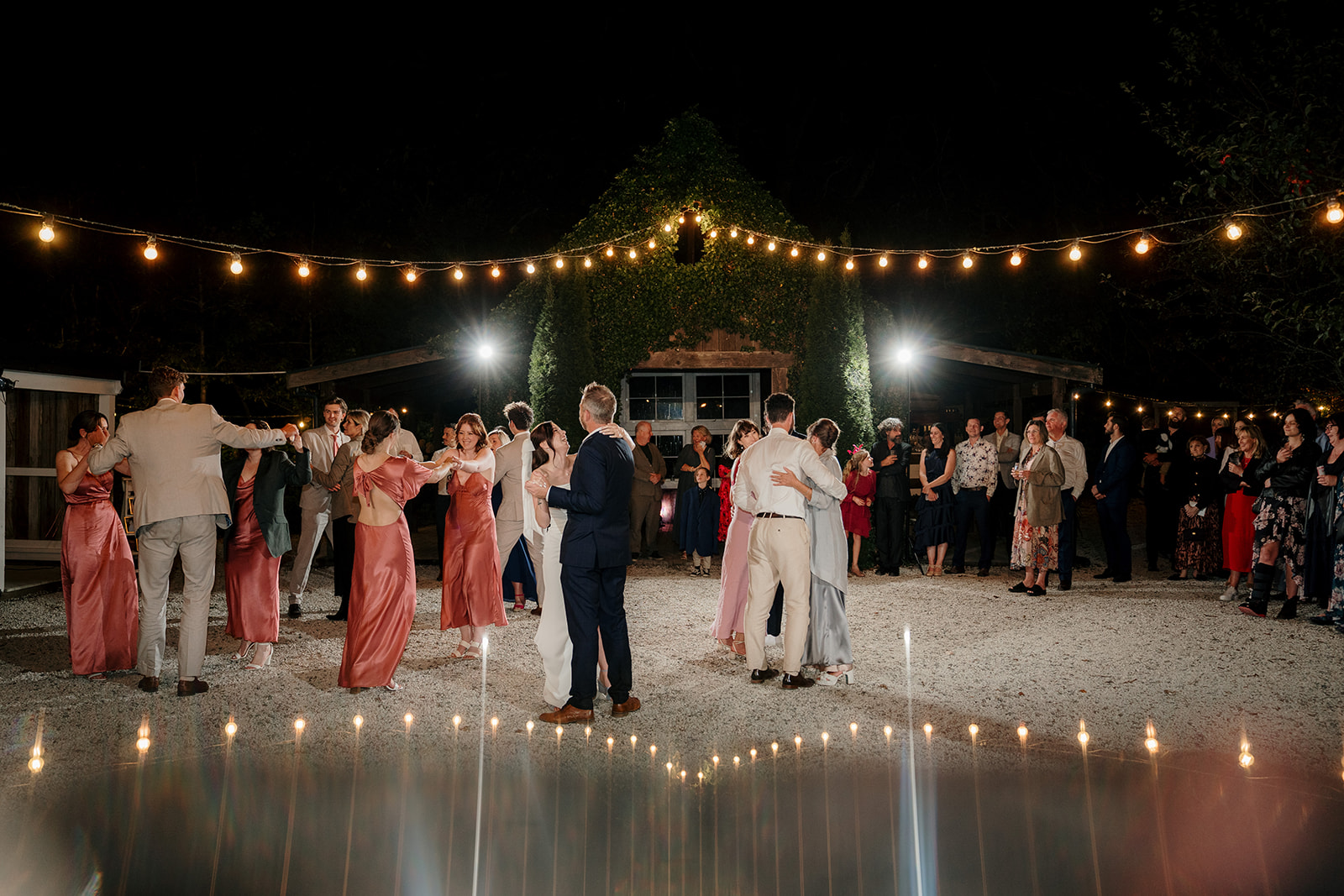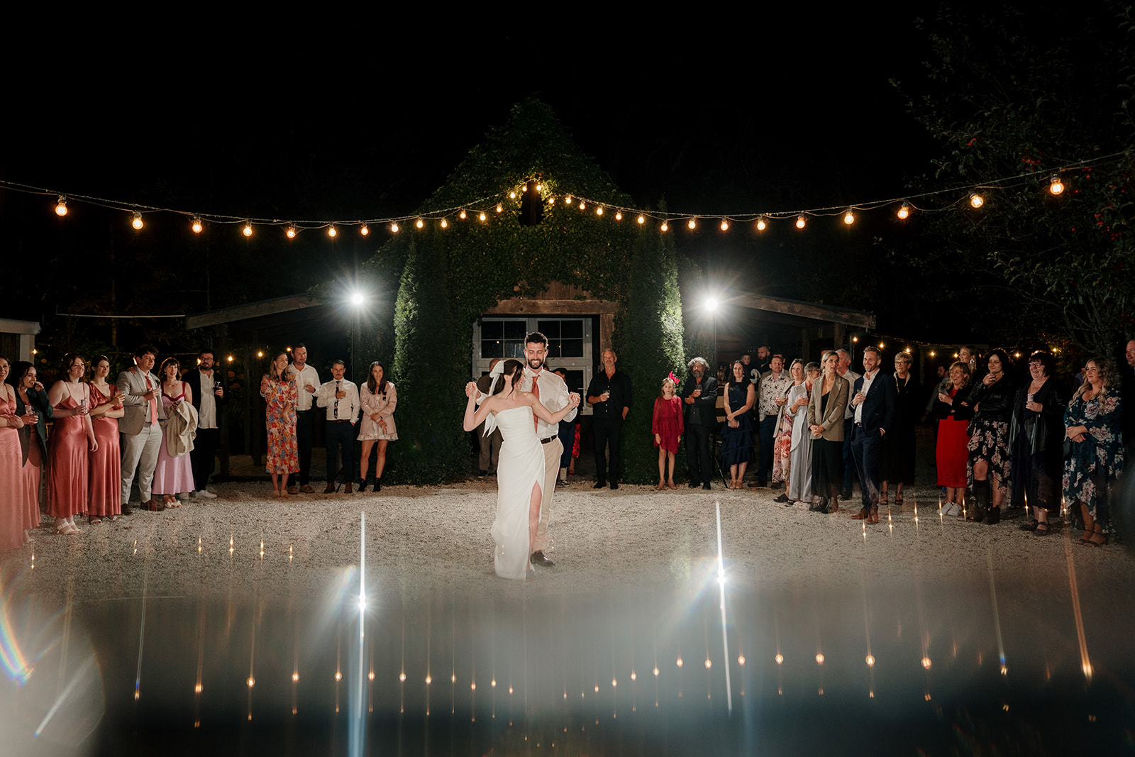 As evening fell, the magic continued. Beneath ivy-draped canopies and glowing fairy lights, Amber and Mitch shared their first dance in the schoolyard. Dear White Productions captured the atmosphere perfectly – the sparkle of fairy lights, the music of Lana Fia, and the joy of a dance floor buzzing with Taylor Swift anthems.
