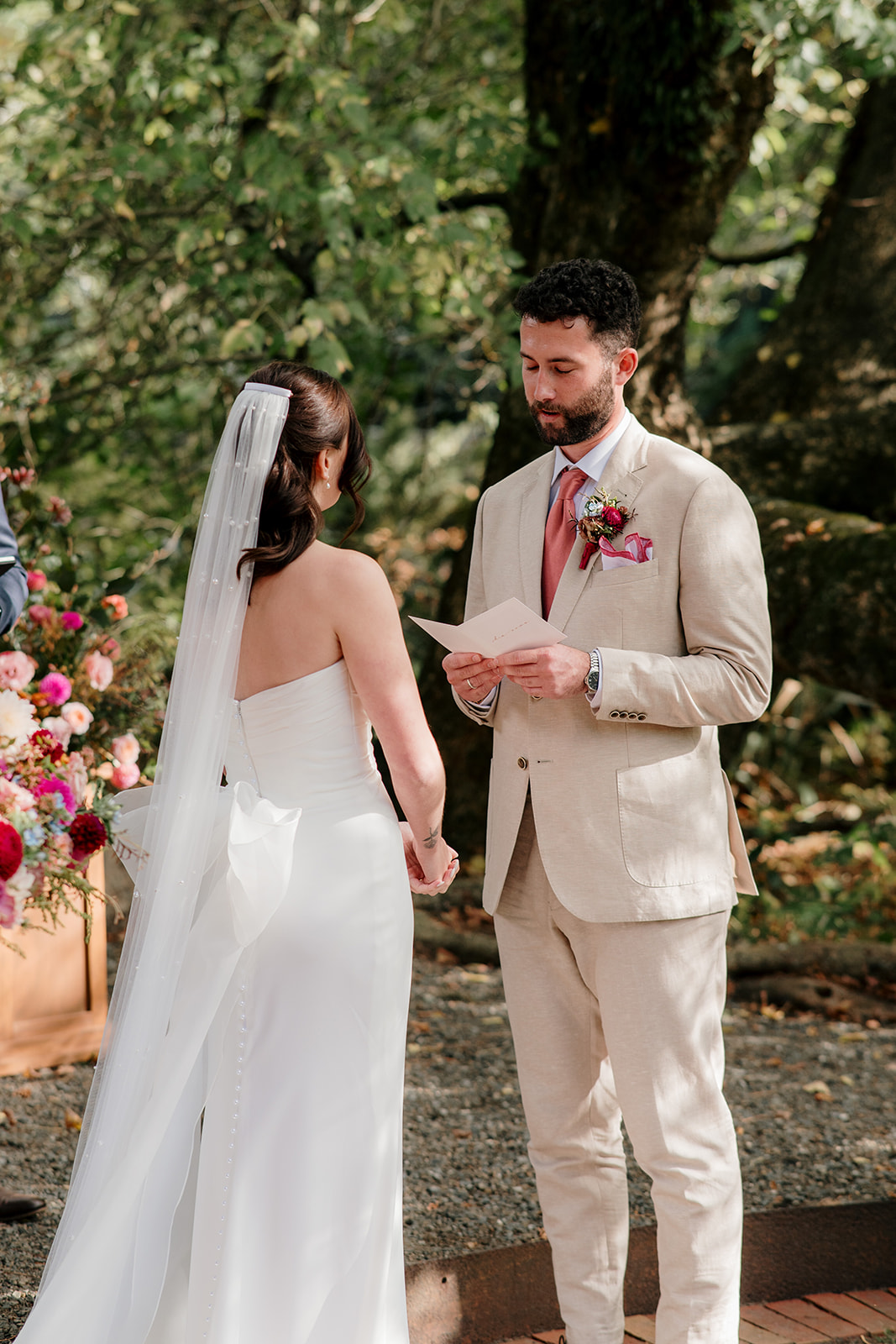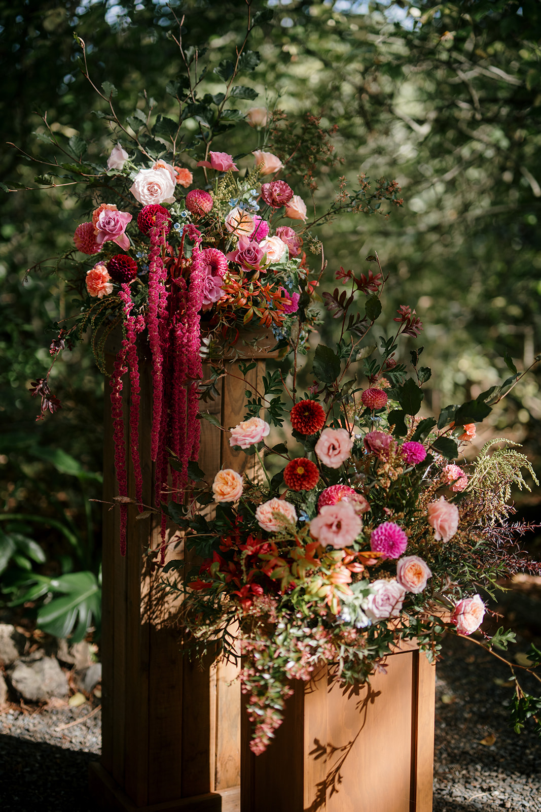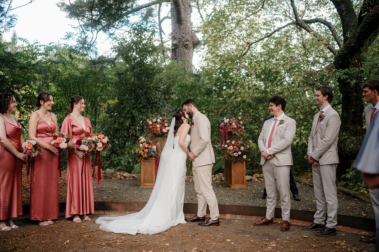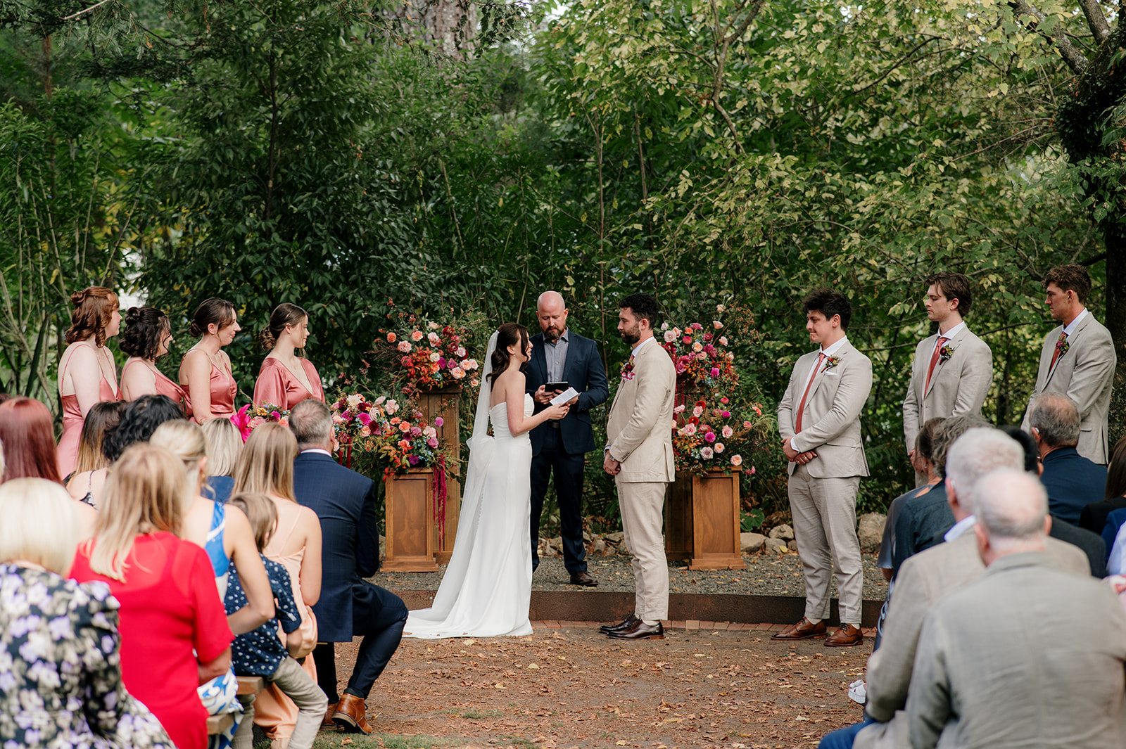Beneath a towering old tree, surrounded by lush woodland, Amber and Mitch exchanged vows in a ceremony led by celebrant Justin Cherry. The scene was brought to life with Handpicked Florist’s striking floral columns in bold pink and magenta tones, creating the most breathtaking backdrop.
