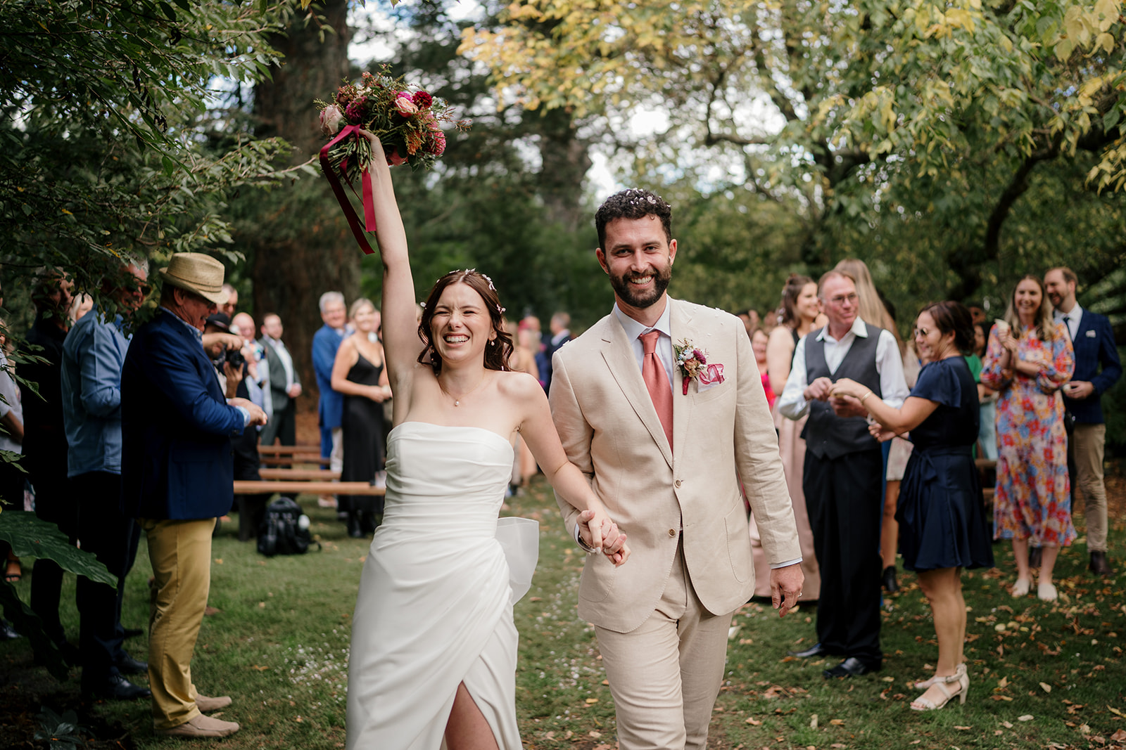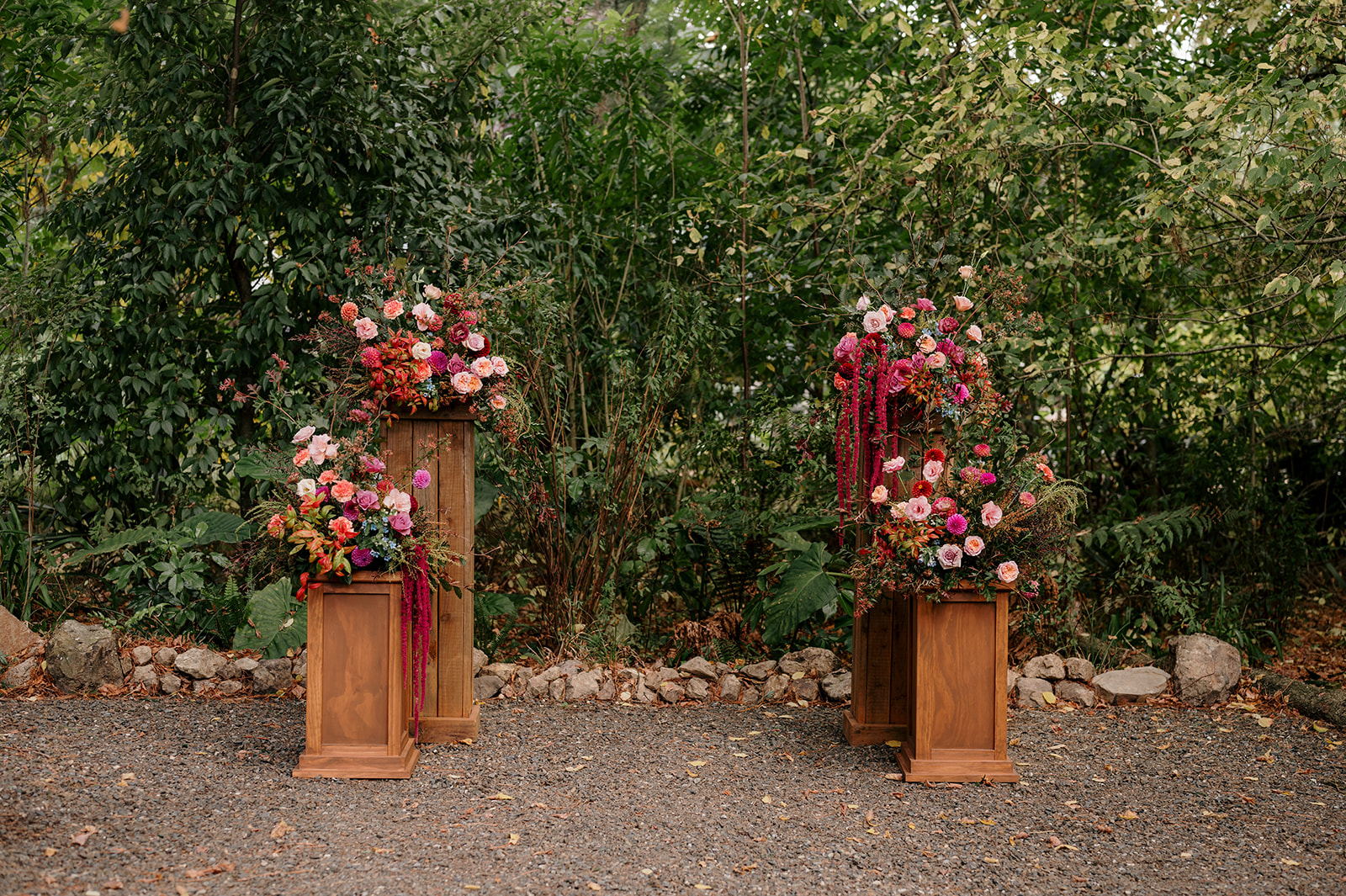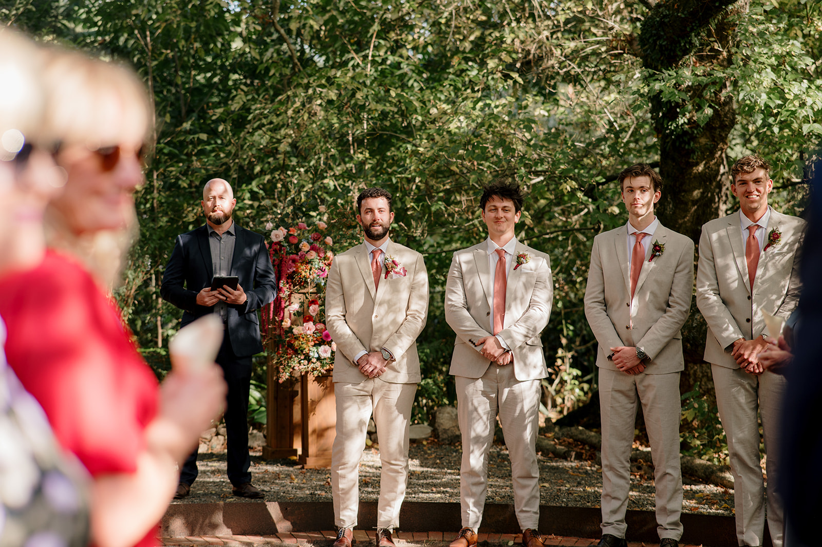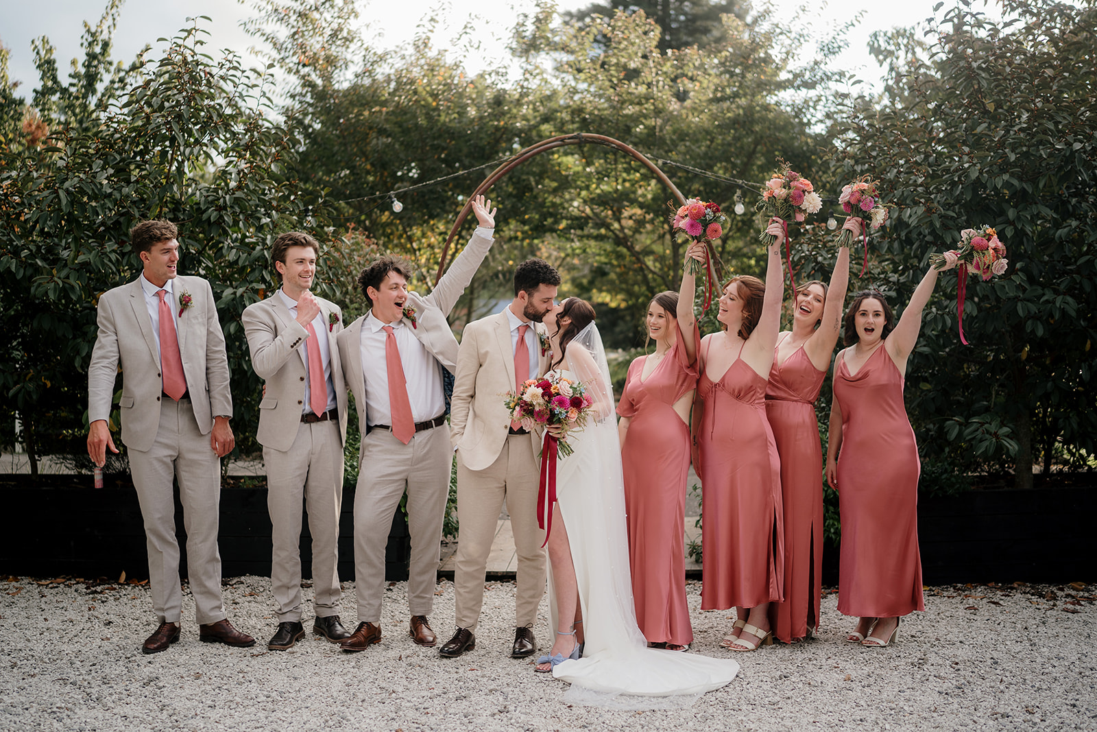 Beneath a towering old tree, surrounded by lush woodland, Amber and Mitch exchanged vows in a ceremony led by celebrant Justin Cherry. The scene was brought to life with Handpicked Florist’s striking floral columns in bold pink and magenta tones, creating the most breathtaking backdrop.