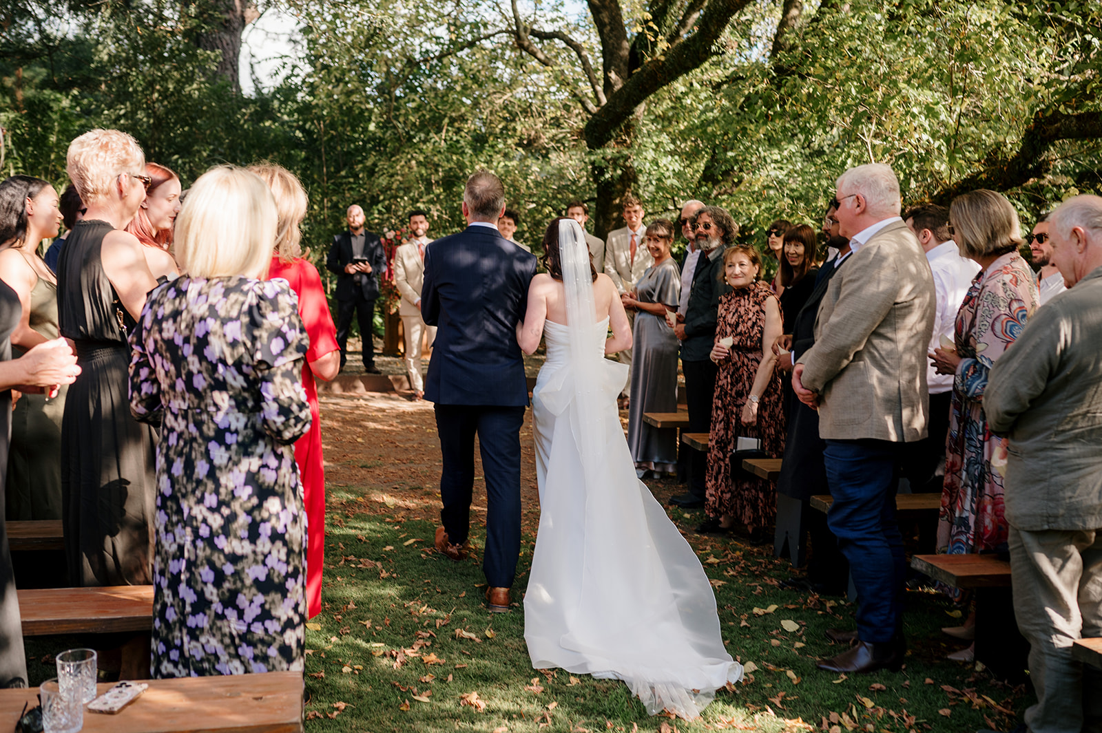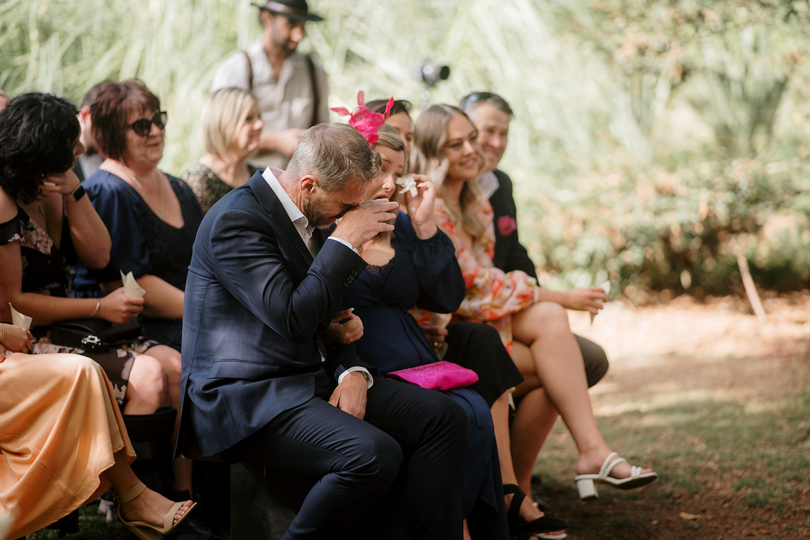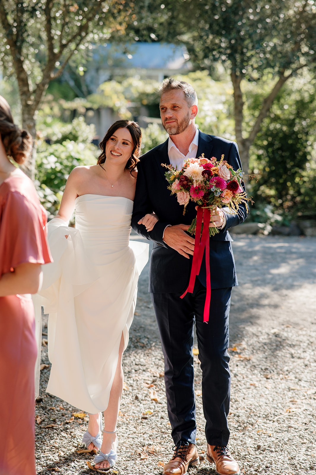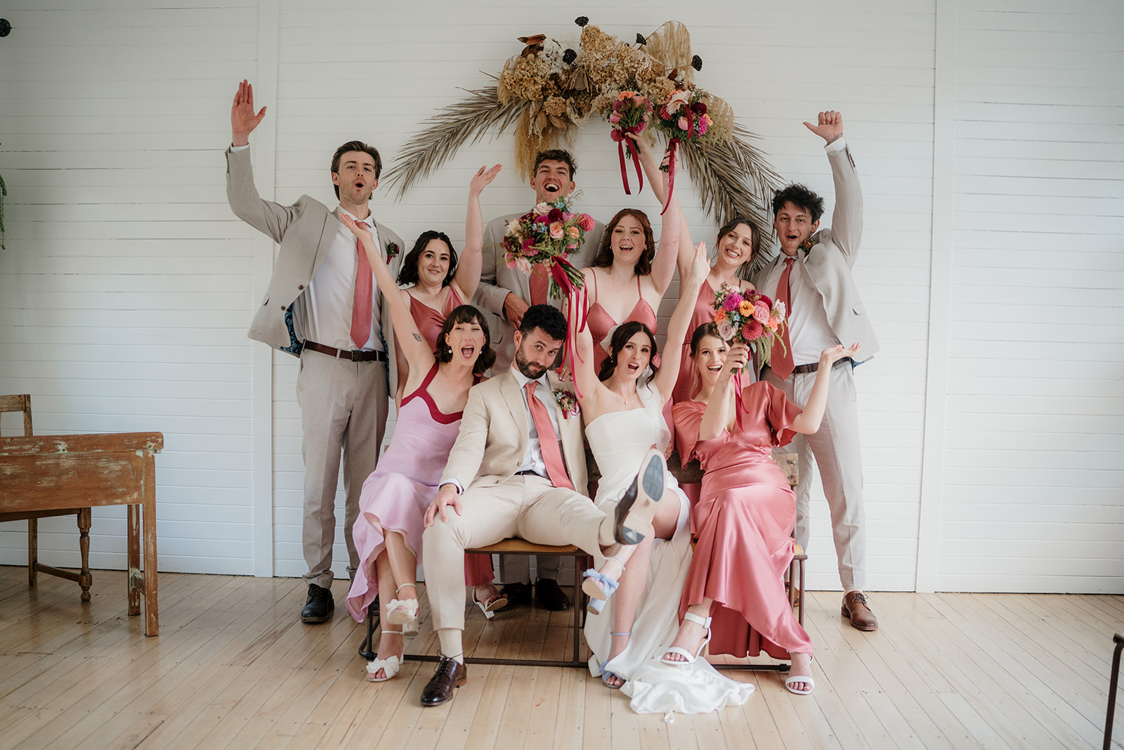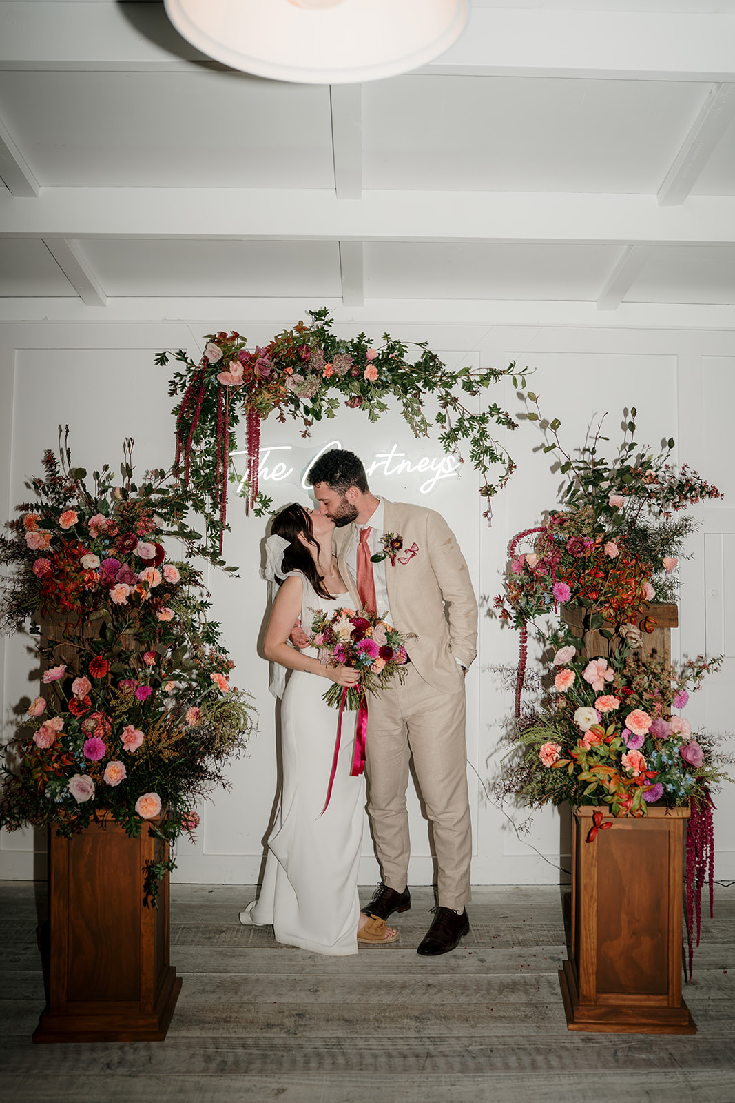 Beneath a towering old tree, surrounded by lush woodland, Amber and Mitch exchanged vows in a ceremony led by celebrant Justin Cherry. The scene was brought to life with Handpicked Florist’s striking floral columns in bold pink and magenta tones, creating the most breathtaking backdrop.