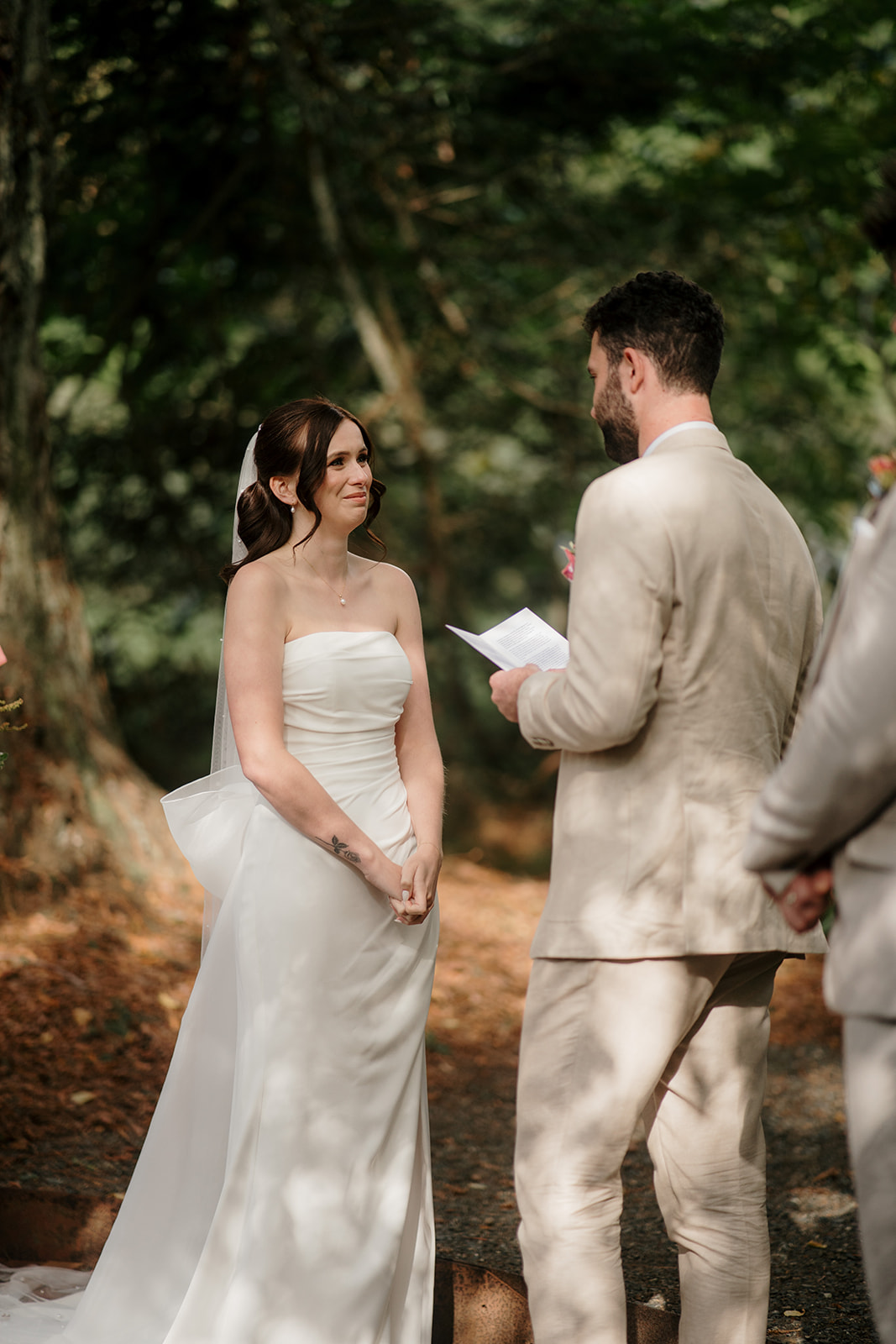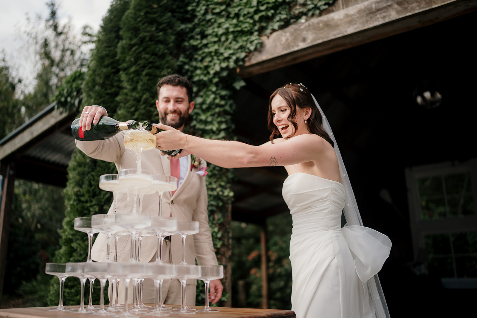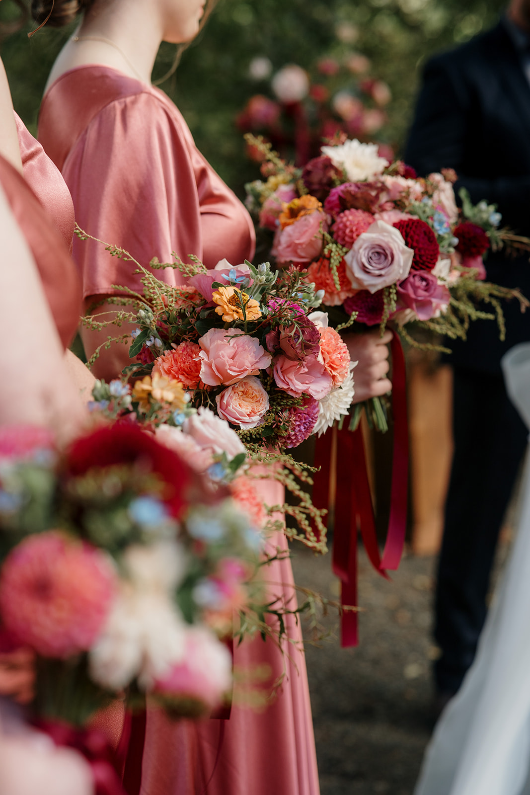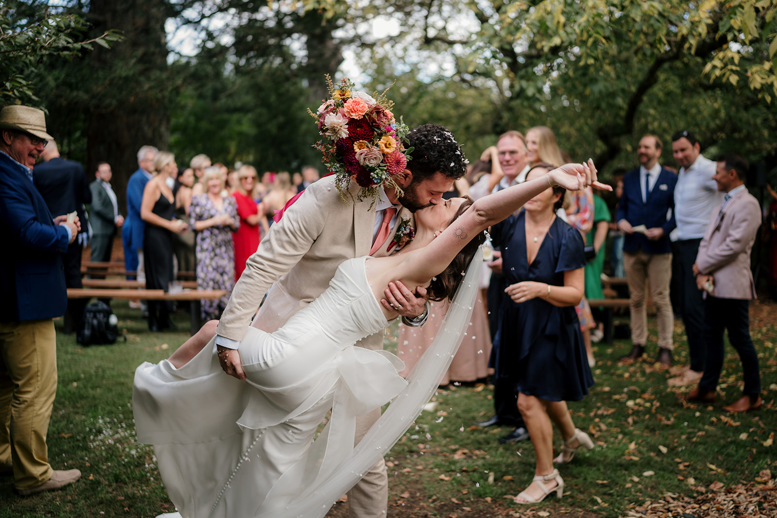 Beneath a towering old tree, surrounded by lush woodland, Amber and Mitch exchanged vows in a ceremony led by celebrant Justin Cherry. The scene was brought to life with Handpicked Florist’s striking floral columns in bold pink and magenta tones, creating the most breathtaking backdrop.