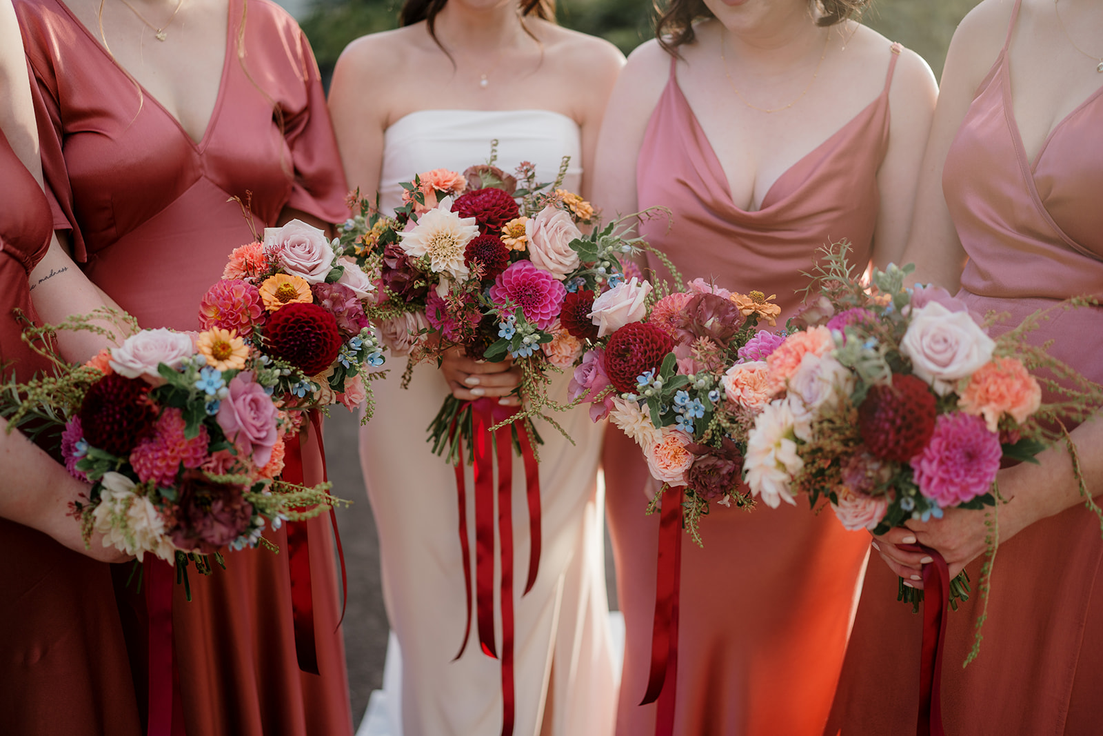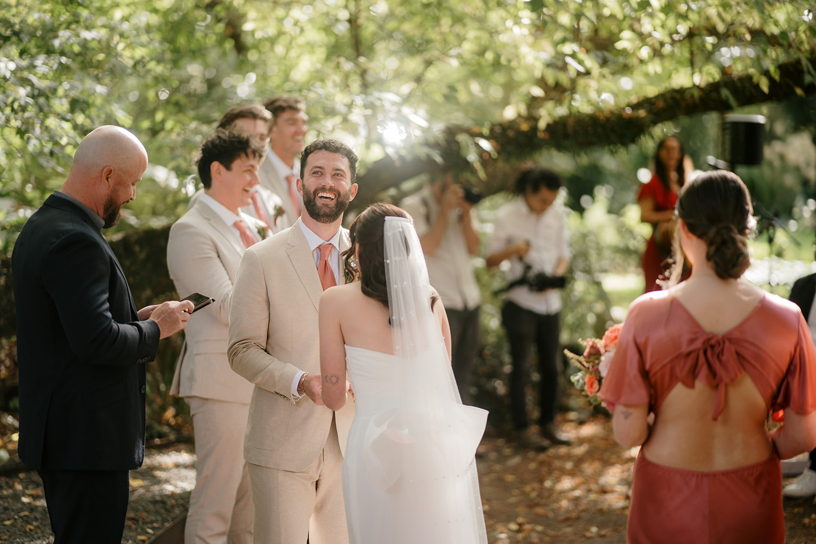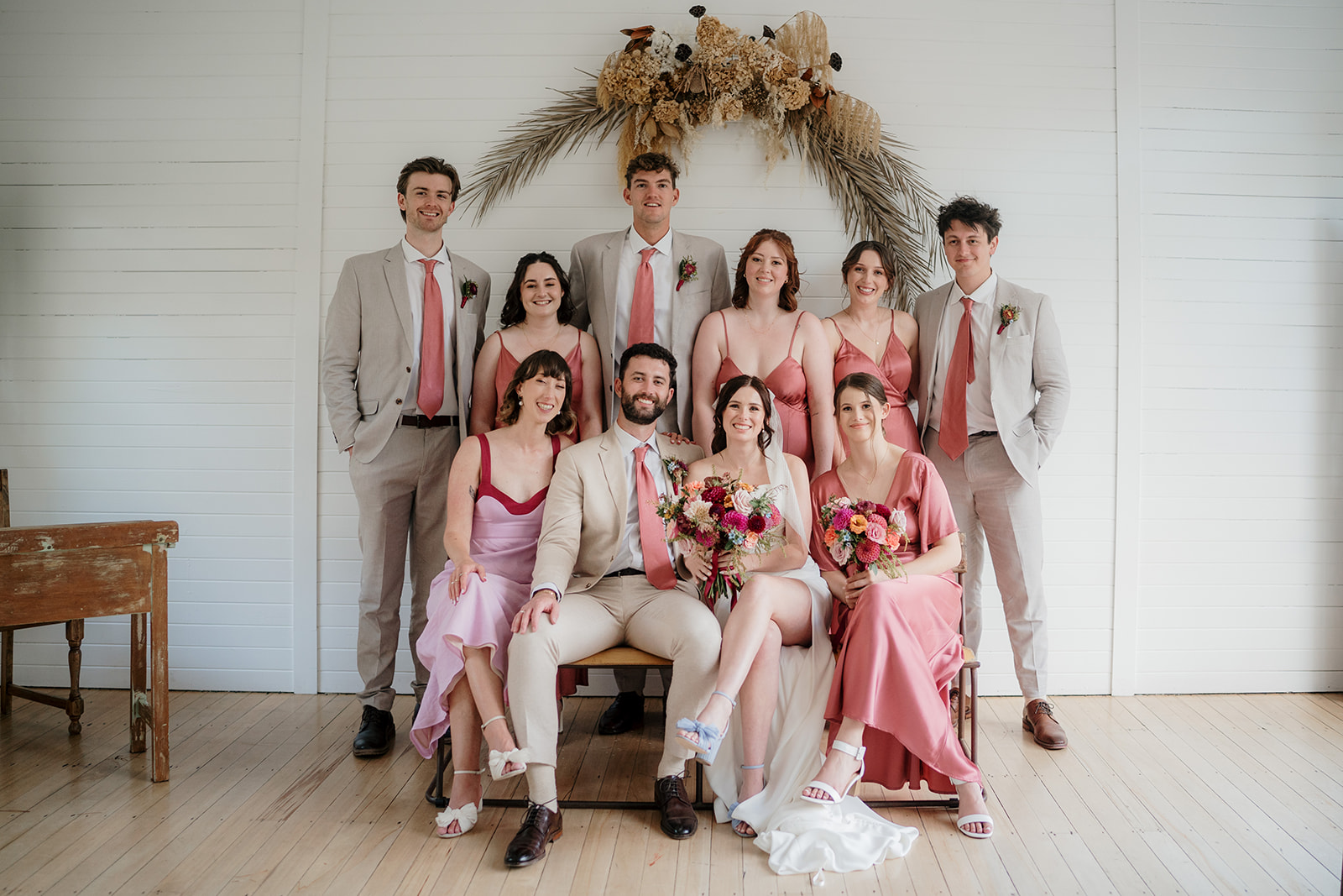 Amber’s Hera Couture gown featured sleek lines and a dramatic bow, paired with Loeffler Randall “something blue” heels. Mitch looked effortlessly sharp in a beige Joe Black suit and blush tie, perfectly complementing the bridesmaids in Blak Bridesmaids satin dresses. Together, the bridal party set the tone for timeless elegance with a modern twist.