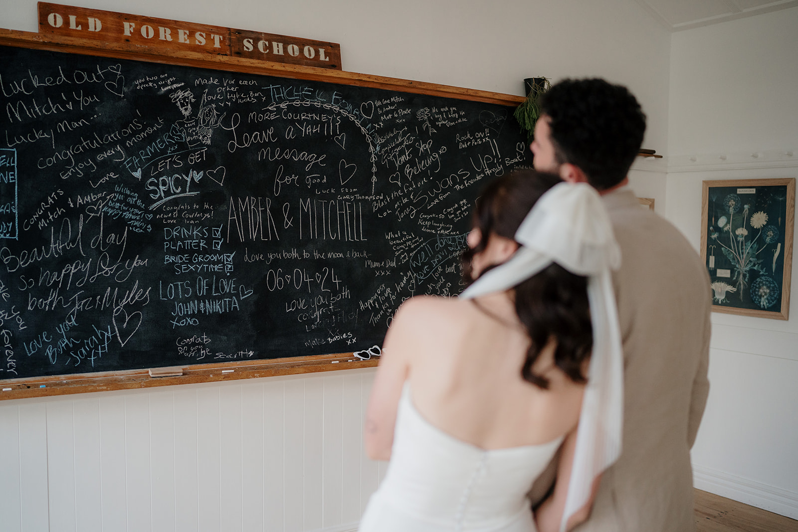 After the ceremony, guests gathered for a champagne tower celebration and lawn games on the school’s tennis court. In true Old Forest School fashion, Amber and Mitch wove the venue’s nostalgic details into their day—guests filled a giant classroom blackboard with heartfelt messages and fun sketches.