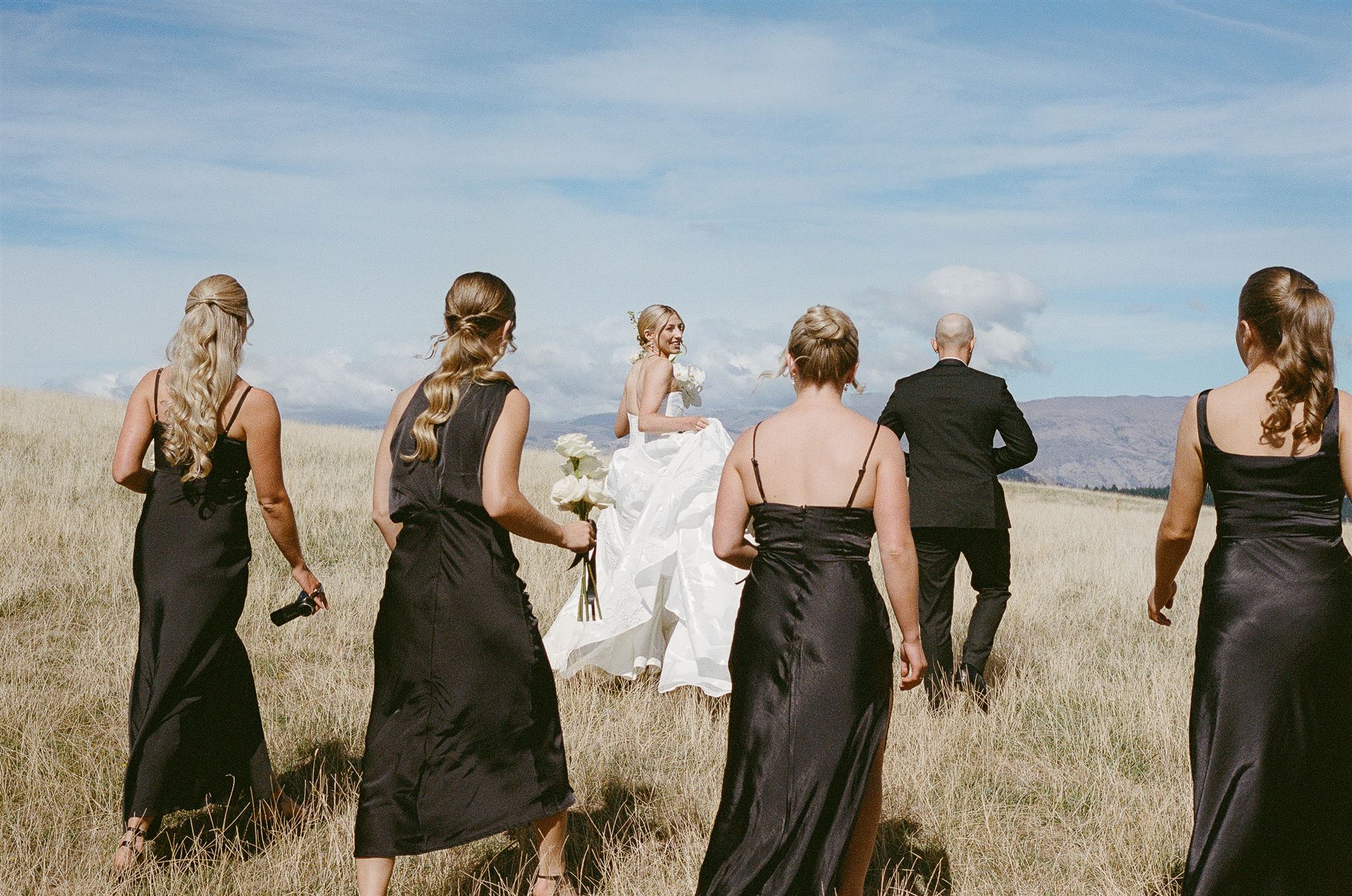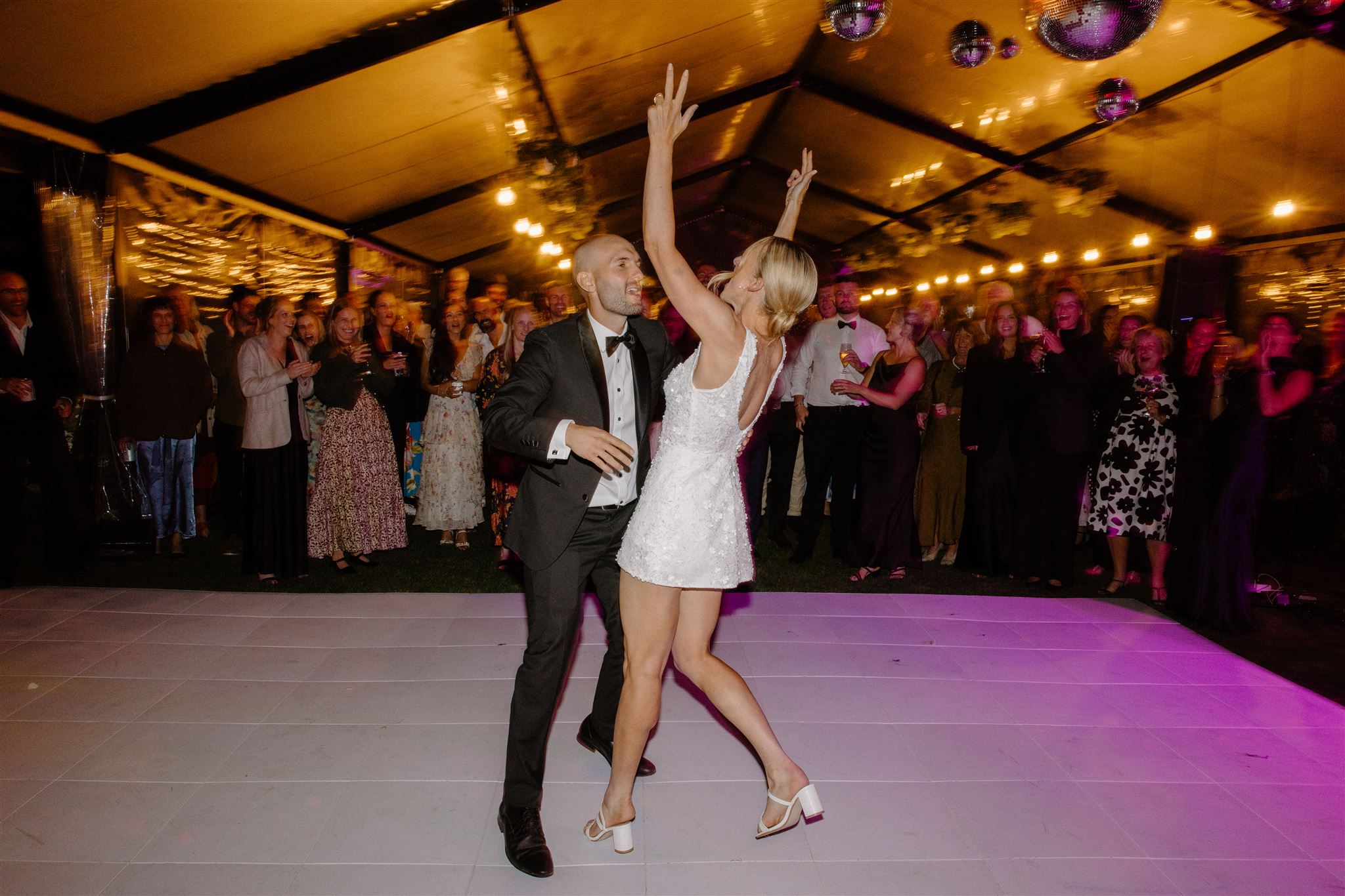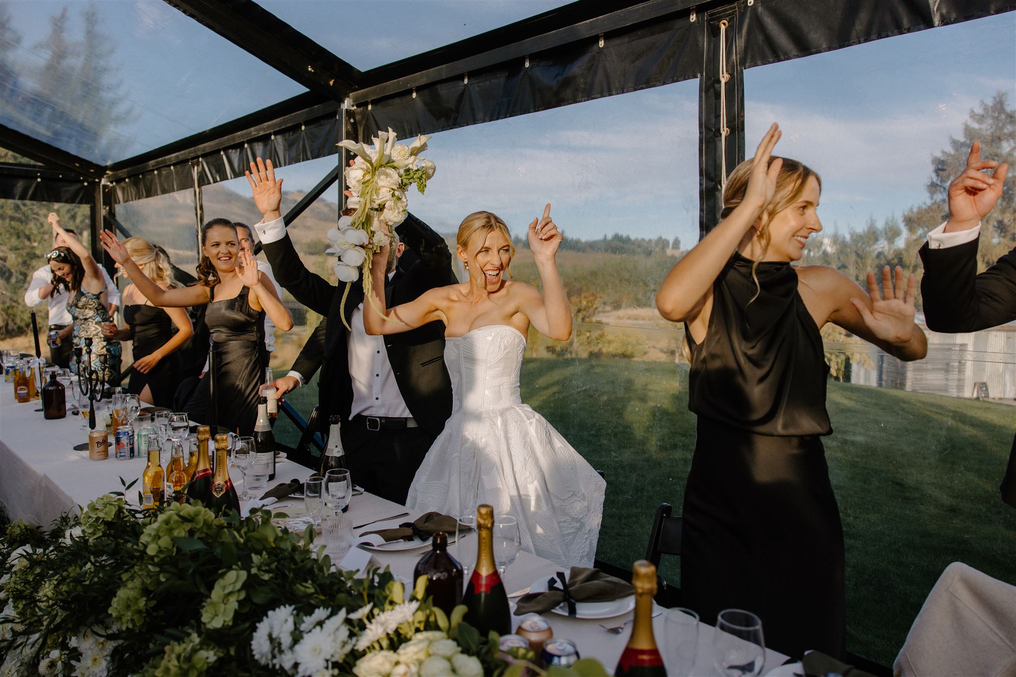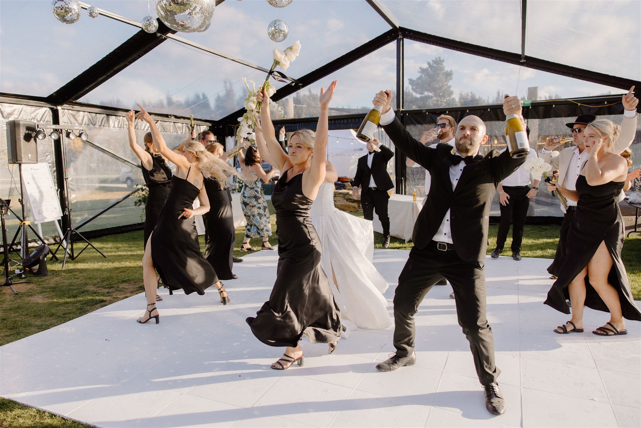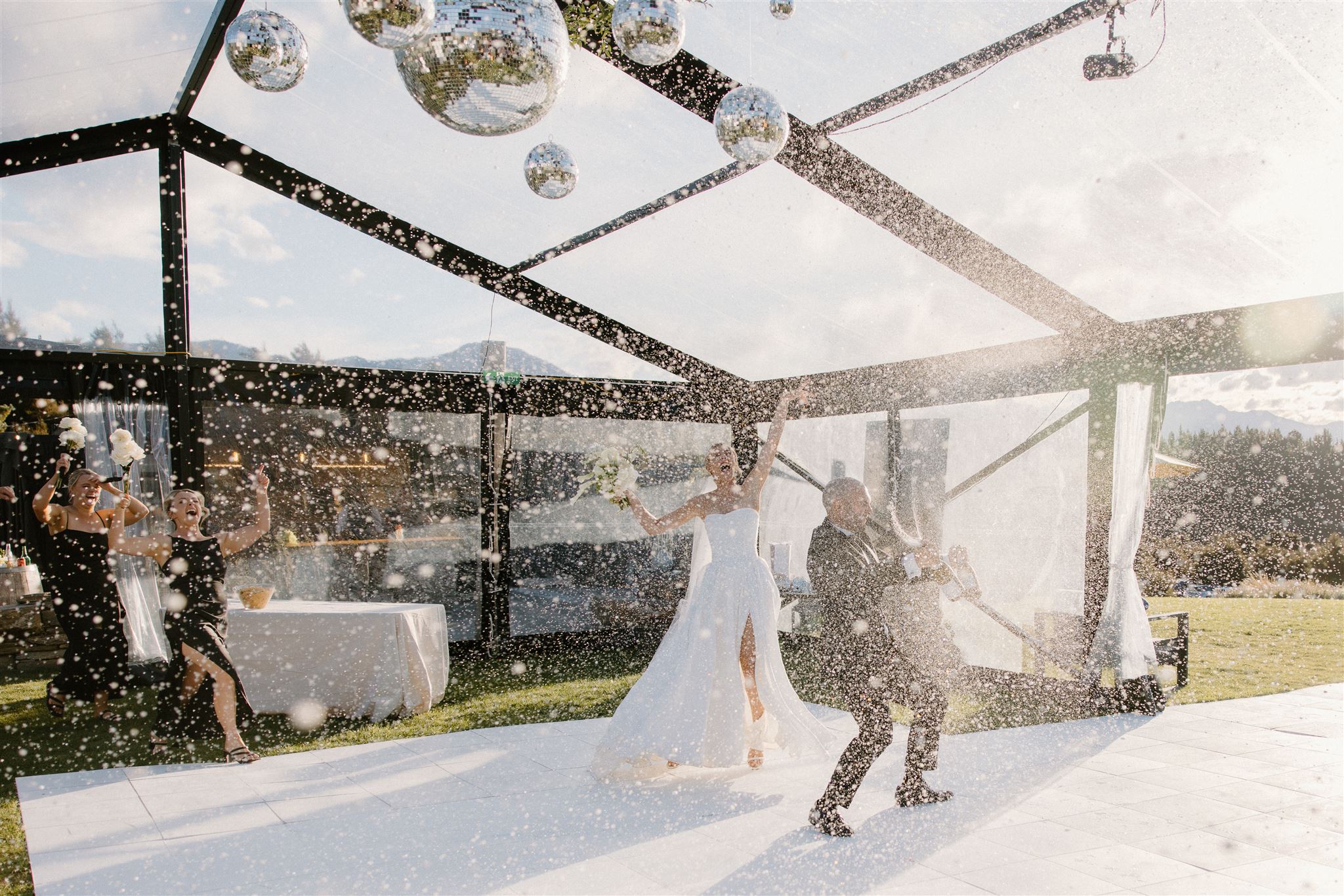The dance floor was its own kind of magic – disco balls sparkling overhead, a packed marquee full of good vibes, and champagne popping off like fireworks. One of our favourite behind-the-scenes moments? The photographer getting absolutely drenched in bubbly while Wedd Films NZ ducked behind them for cover. If that doesn’t scream party of the year, we don’t know what does.