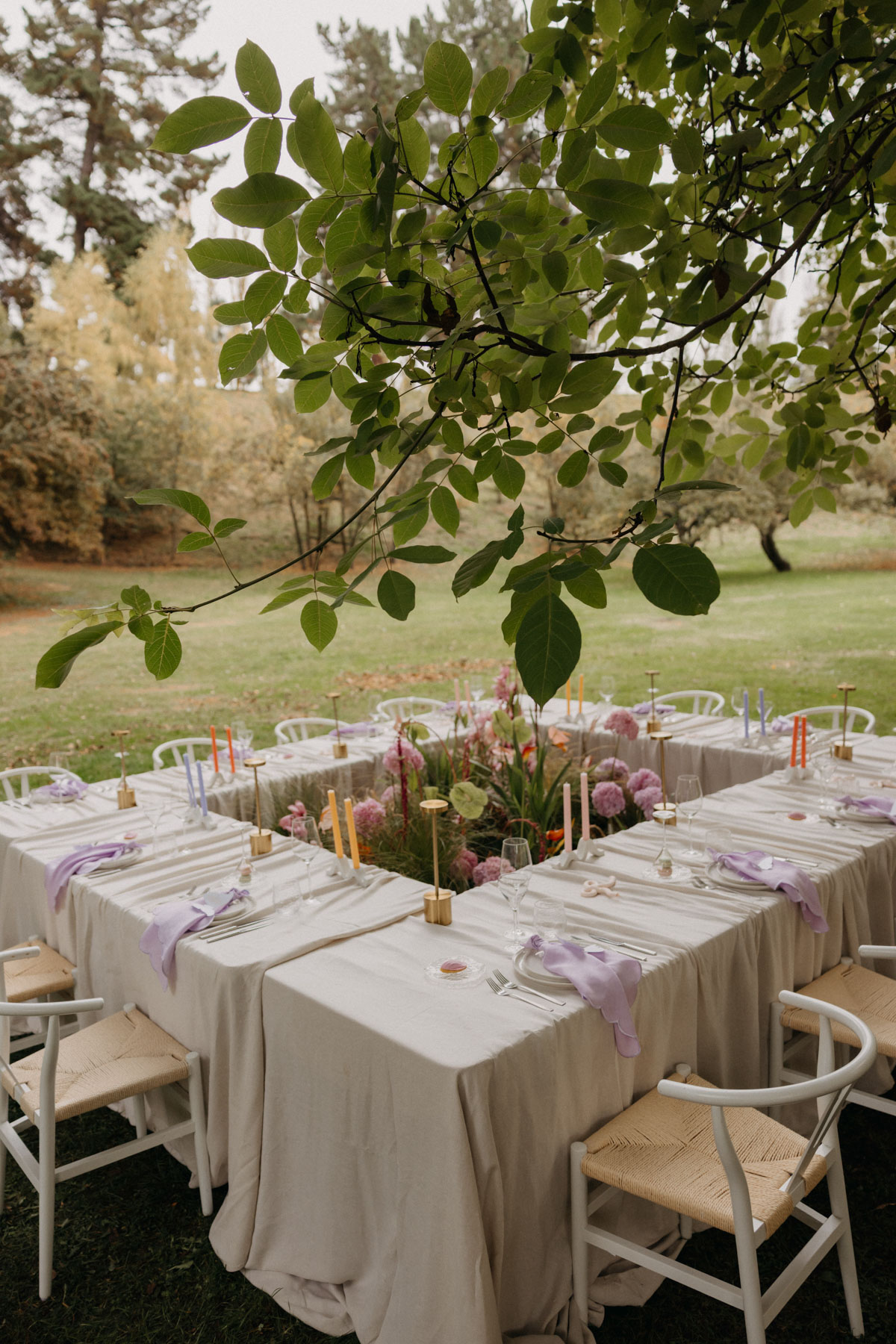 Set beneath the golden canopy of autumn trees, we leaned into the richness of the season, pairing bold, contemporary florals with a whimsical, open-air tablescape designed to feel both grounded and magical.