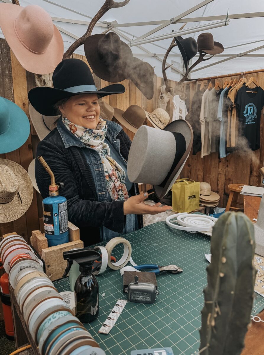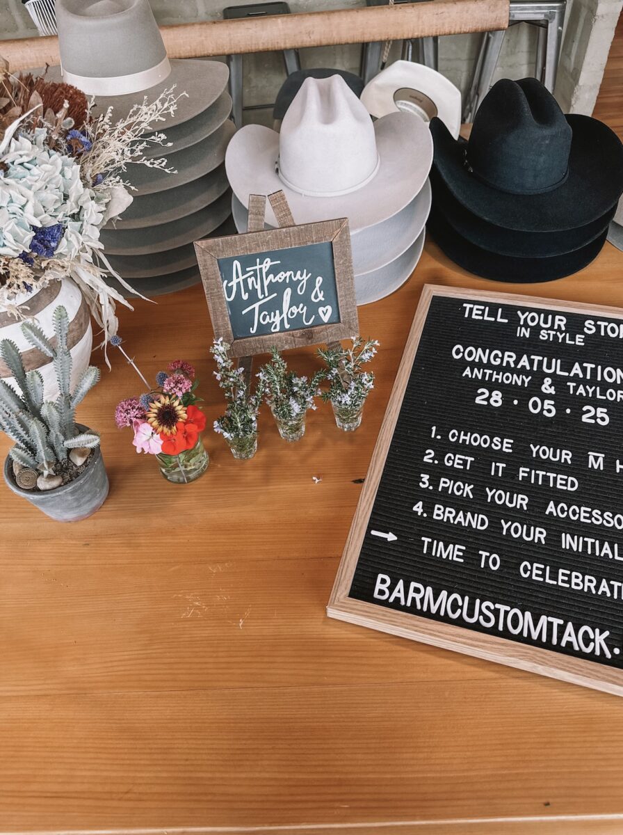 The Bar M Wedding Custom Hat Bar brings a fully interactive, live hat-making experience to your day. Set up on-site, we fit, shape, and style custom hats for you and your guests—right there, in real time. No guessing sizes. No one-size-fits-all. Every hat is moulded to the individual, shaped to suit their face, and finished with accessories that tie in with your wedding style, colours, or personal story.