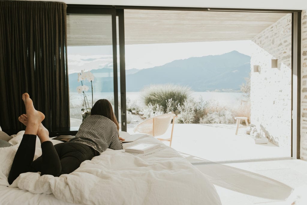 A modern architecturally designed studio. 69m2 in size, consisting of living/sleeping, kitchenette & ensuite, plus outdoor terrace area with an open wood fireplace and your own private garden with stunning lake & mountain views.
