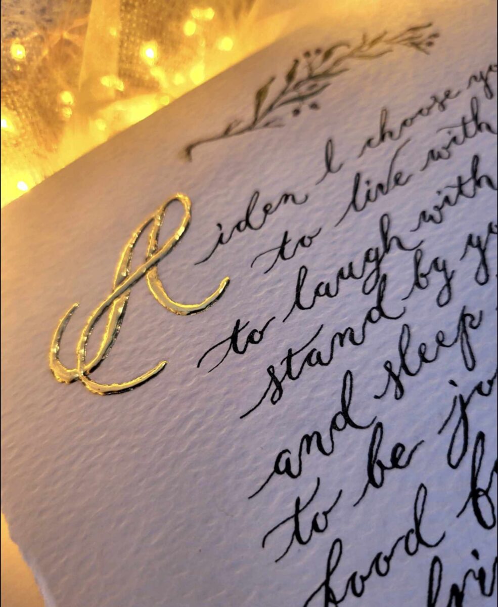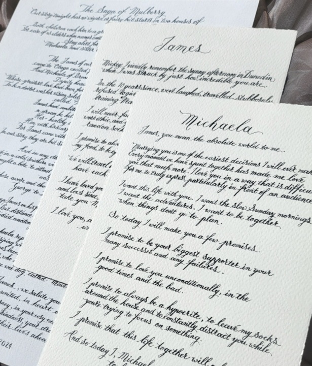 Celebrate your love with bespoke hand-written calligraphy that beautifully preserves your vows, poems, or readings for a lifetime. I specialise in crafting your most meaningful words on luxurious archival paper, using either elegant vintage Copperplate or a graceful modern calligraphy style, or Gothic for a more intense vibe.