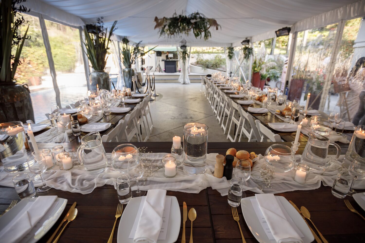 Your reception unfolds in the refined elegance of our white silk-lined marquee, a permanent fixture designed to host up to 60 guests. This luminous, intimate space is a blank canvas, ready to be transformed with fairy lights, drapery, or floral arrangements—allowing you to create a setting that reflects your unique vision and personal style.