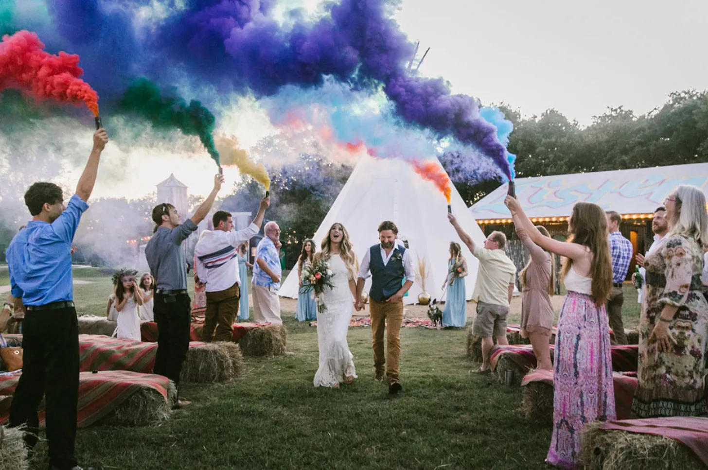 Picture this: you and your love walking hand-in-hand through a dreamy haze of colour — fiery oranges, moody purples, vibrant blues — while your guests cheer, your photographer snaps away, and the sky fills with drama (in the best kind of way).