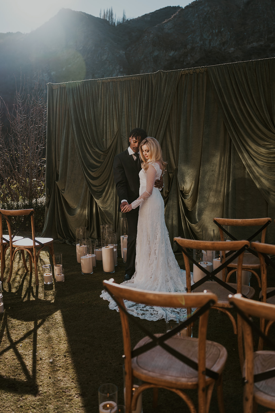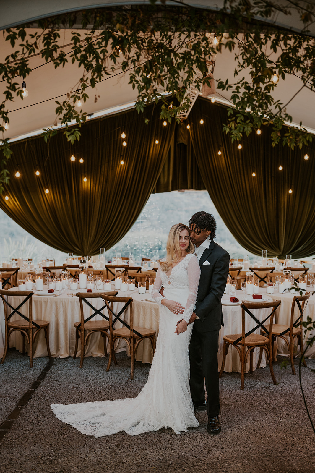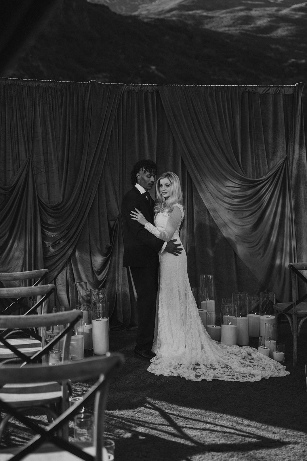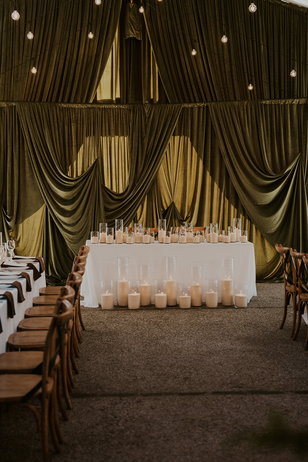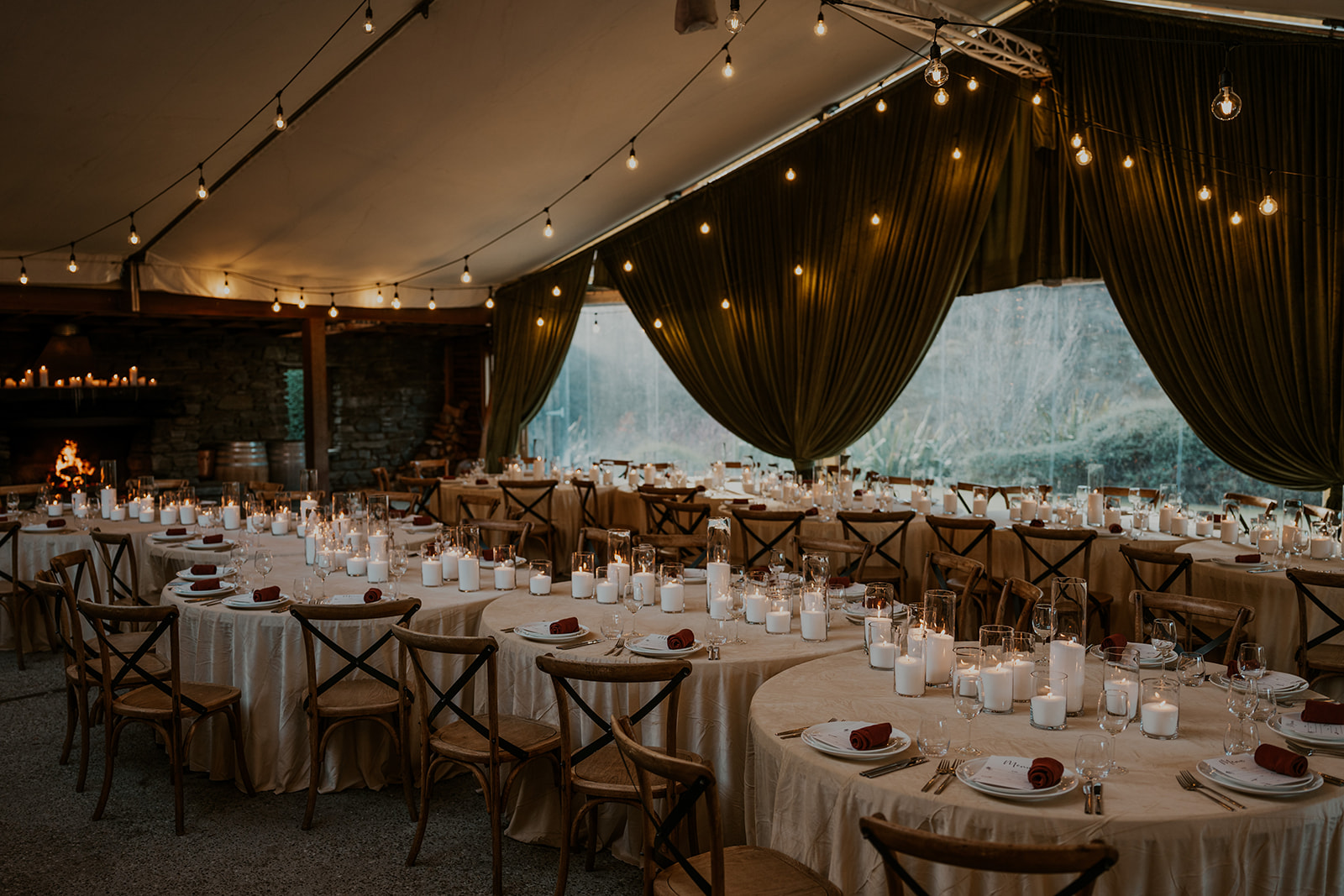 Deep green draping sets the tone straight away, creating a soft, cocoon-like space that feels romantic and immersive. Paired with festoon lighting and layers of candlelight, it’s the kind of atmosphere that makes a winter wedding venue in Queenstown feel truly special.